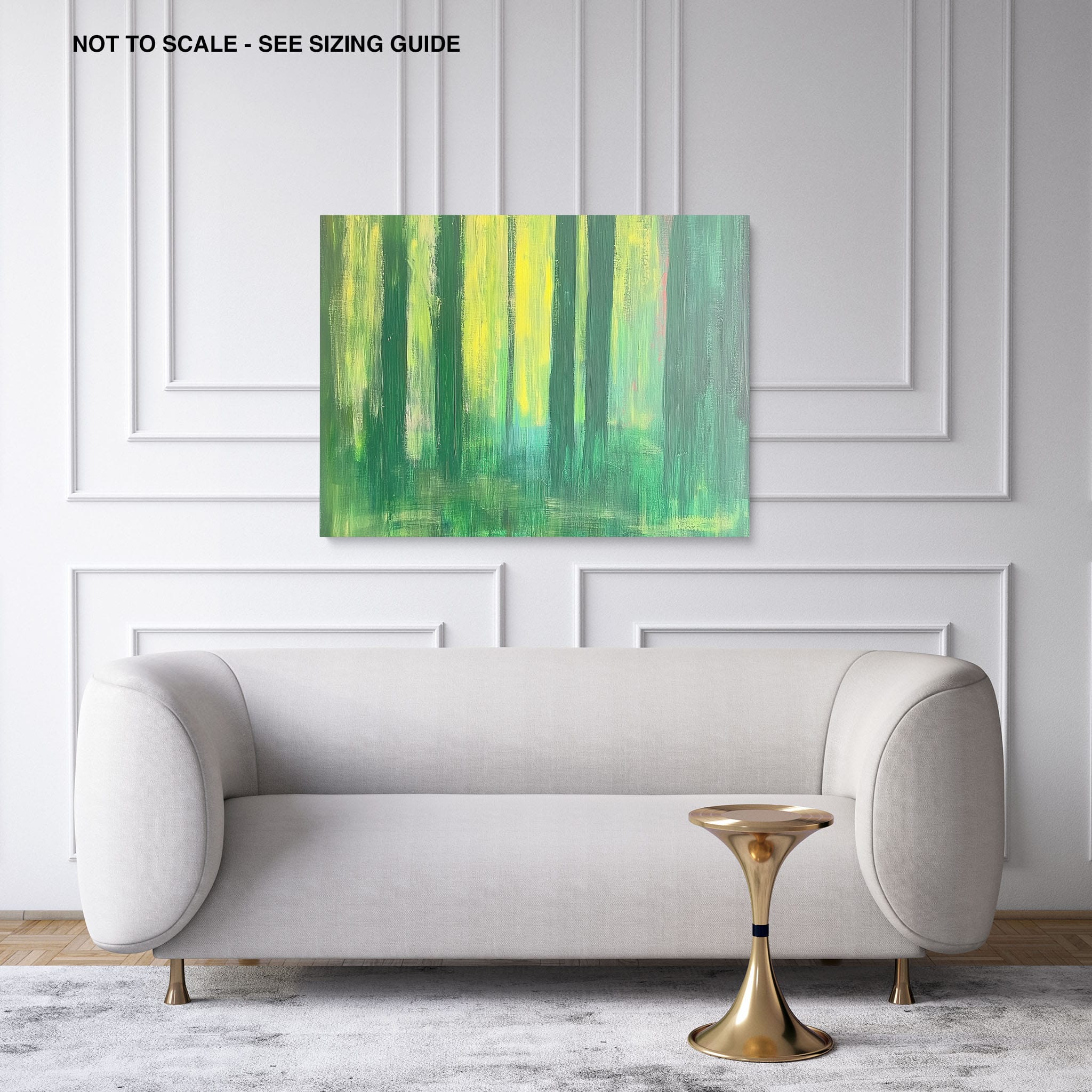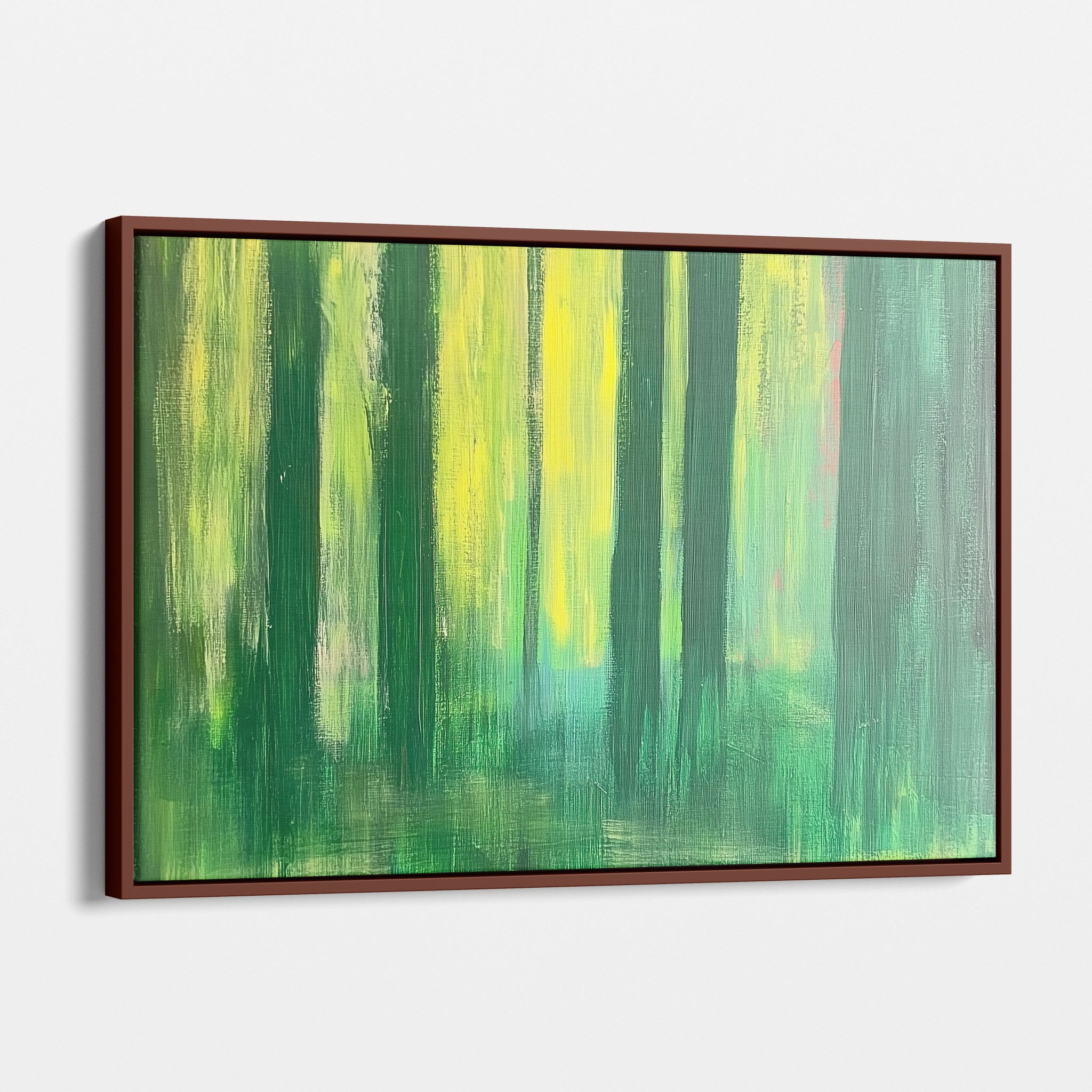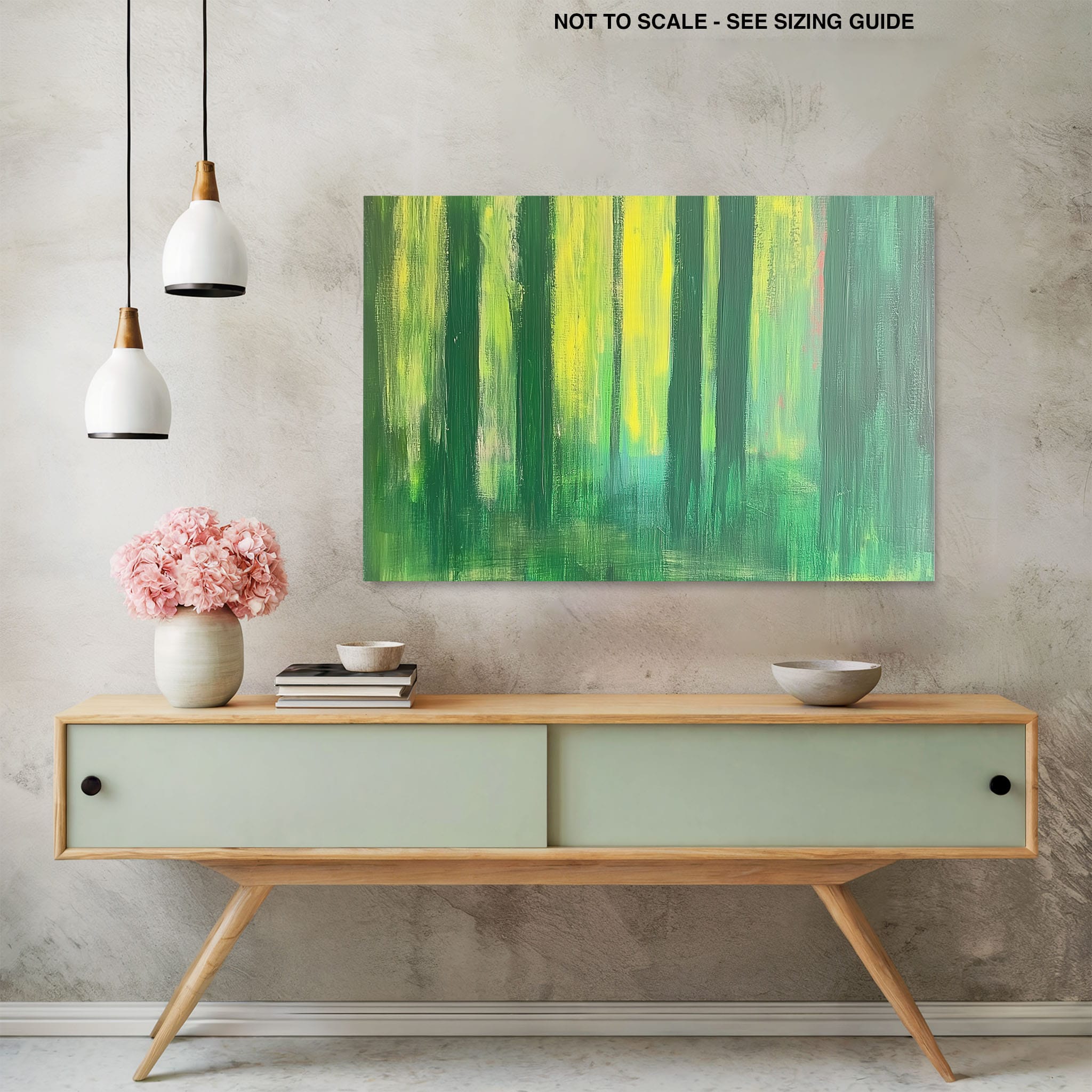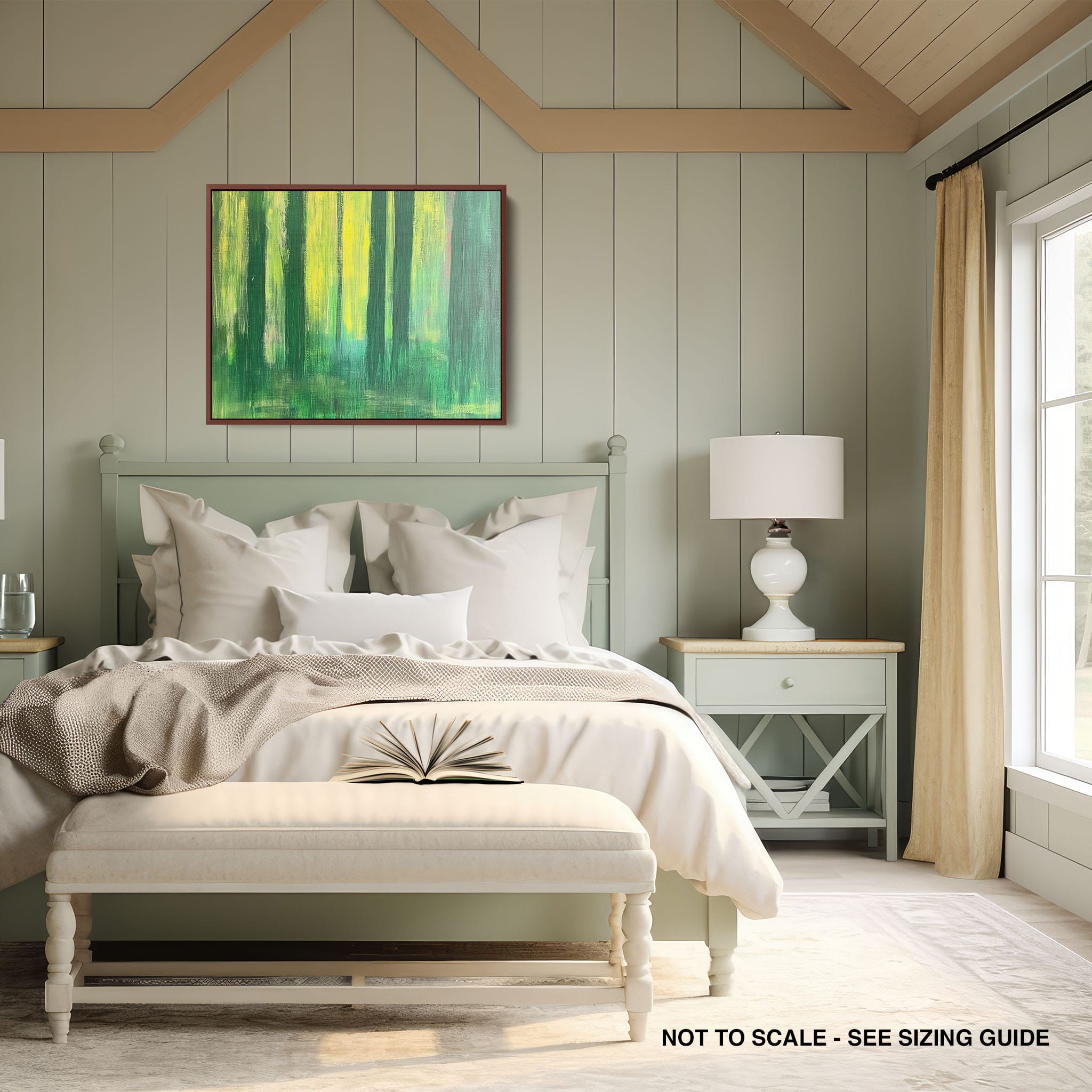 This painting captures the serene essence of a forest through bold strokes and vibrant shades of green. The abstract depiction uses impressionistic influences to evoke the varying light and shadows found within woodland realms. Its modern take on a natural landscape makes it ideal for any space that seeks a touch of tranquility paired with contemporary artistic flair. Add this piece to your décor to bring a fresh, lively energy to any room. Perfect for art lovers seeking a blend of environmental beauty and abstract artistry in their home or office.