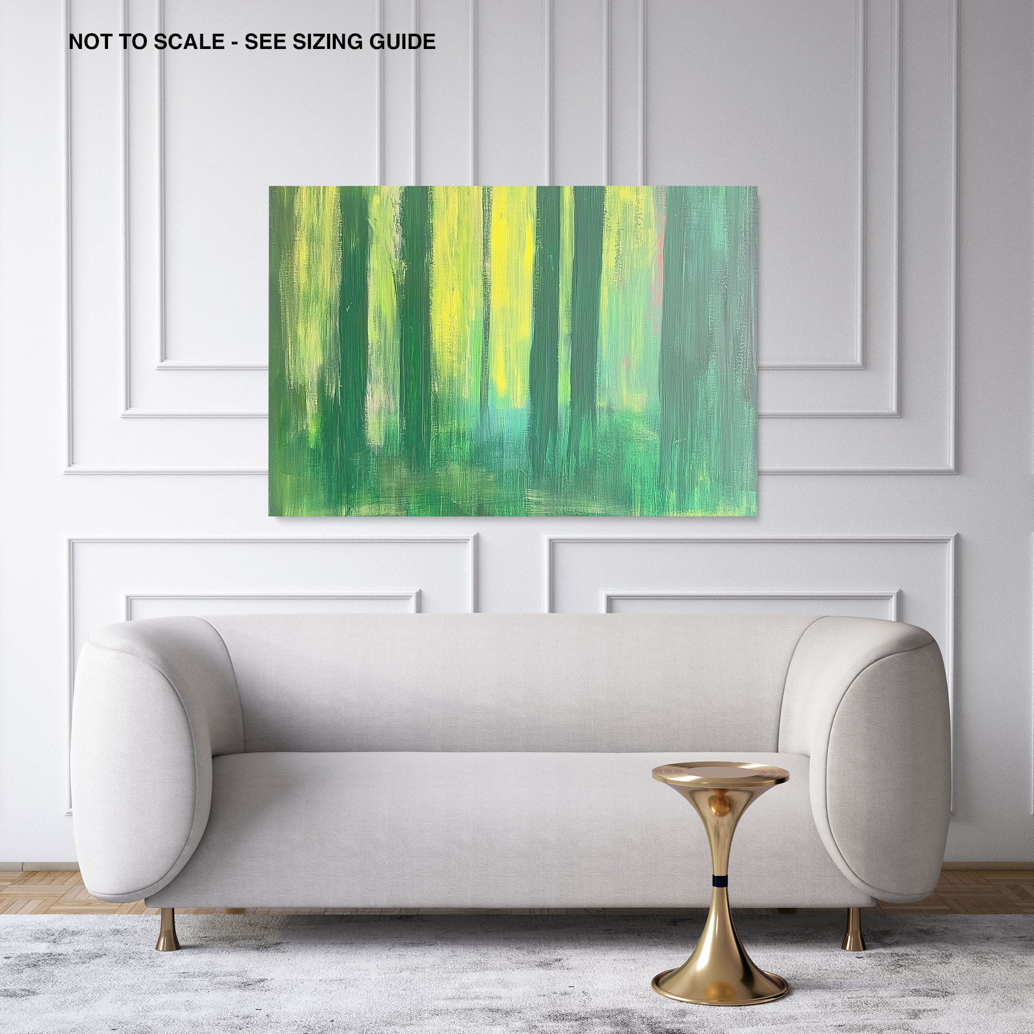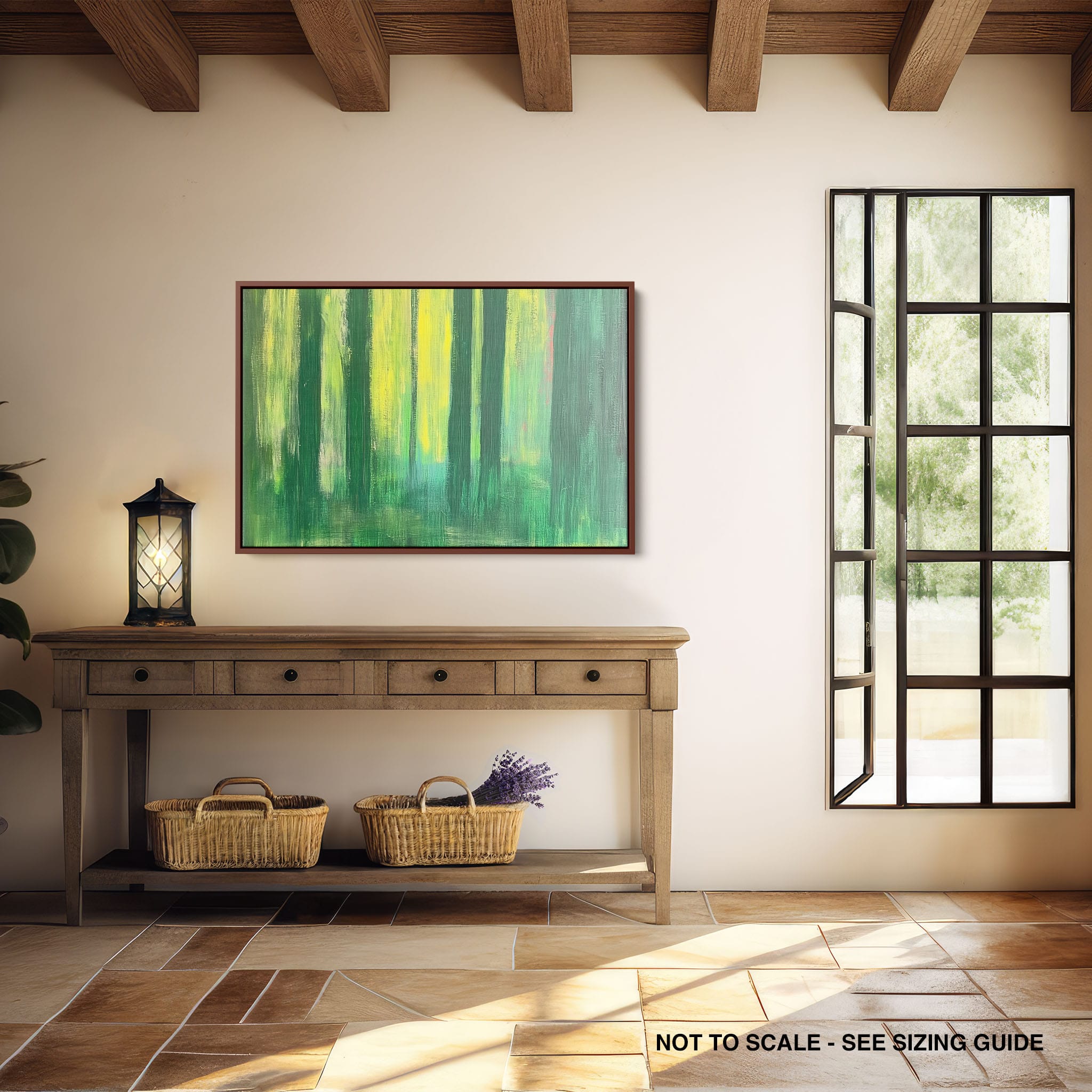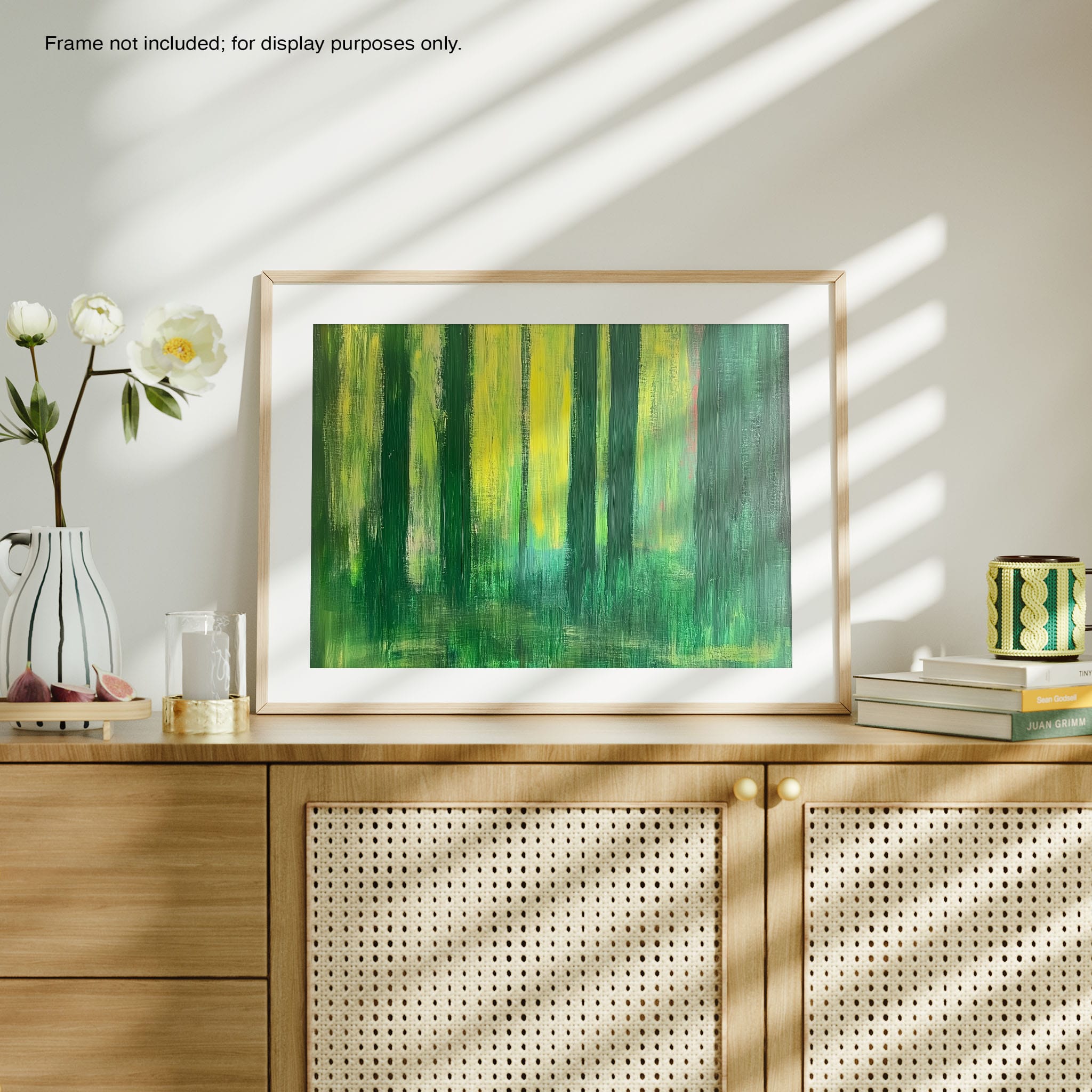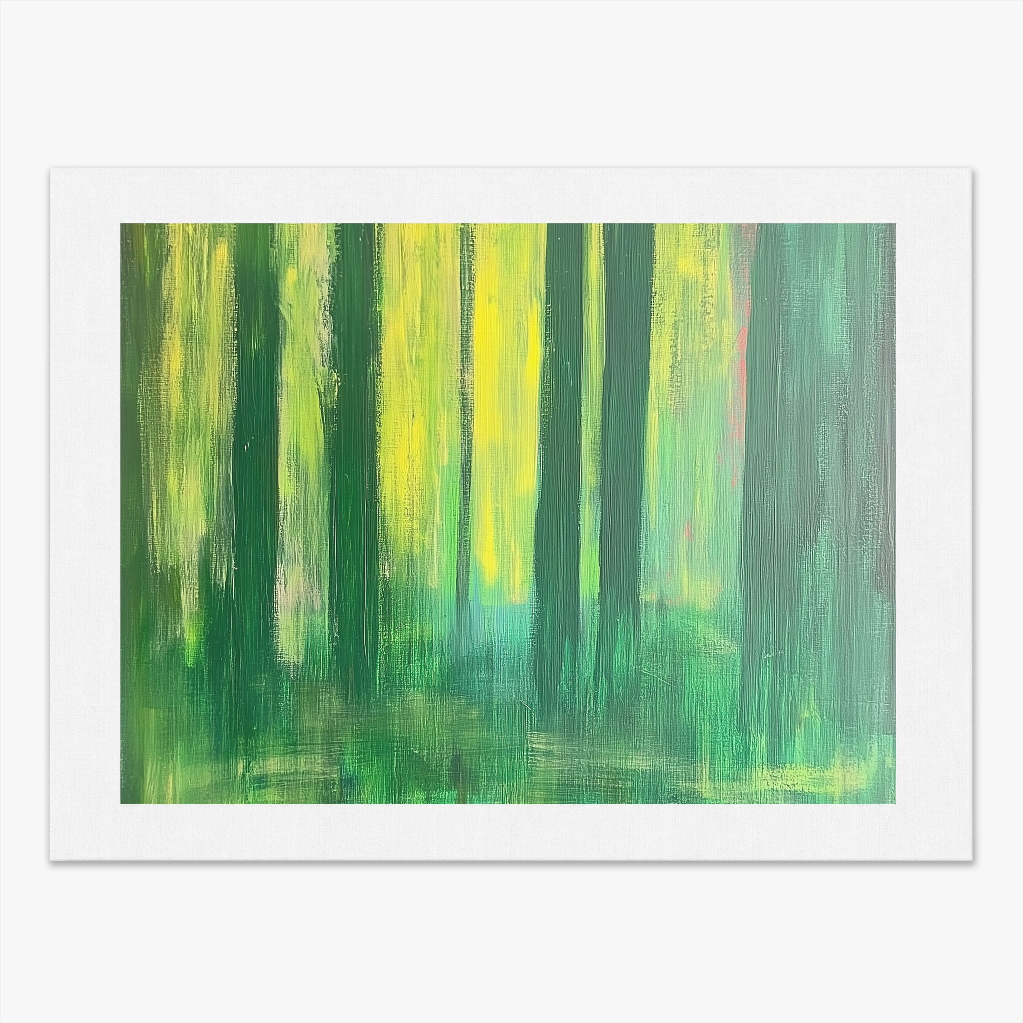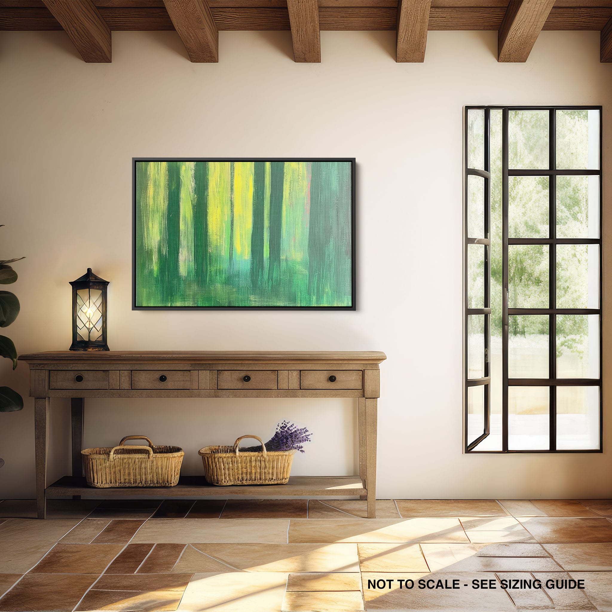 This painting captures the serene essence of a forest through bold strokes and vibrant shades of green. The abstract depiction uses impressionistic influences to evoke the varying light and shadows found within woodland realms. Its modern take on a natural landscape makes it ideal for any space that seeks a touch of tranquility paired with contemporary artistic flair. Add this piece to your décor to bring a fresh, lively energy to any room. Perfect for art lovers seeking a blend of environmental beauty and abstract artistry in their home or office.