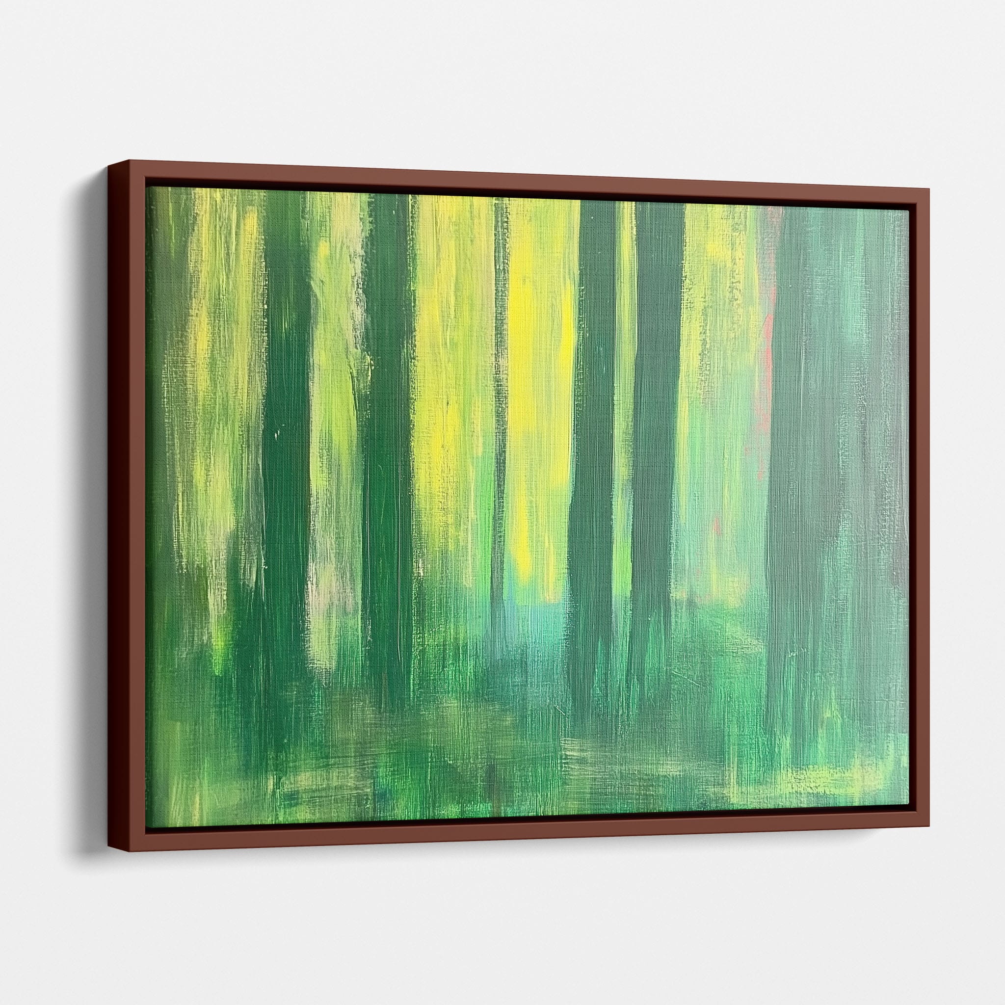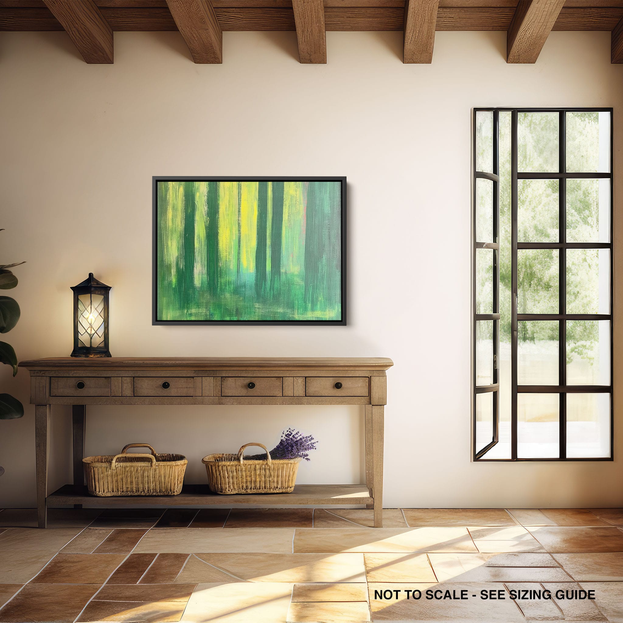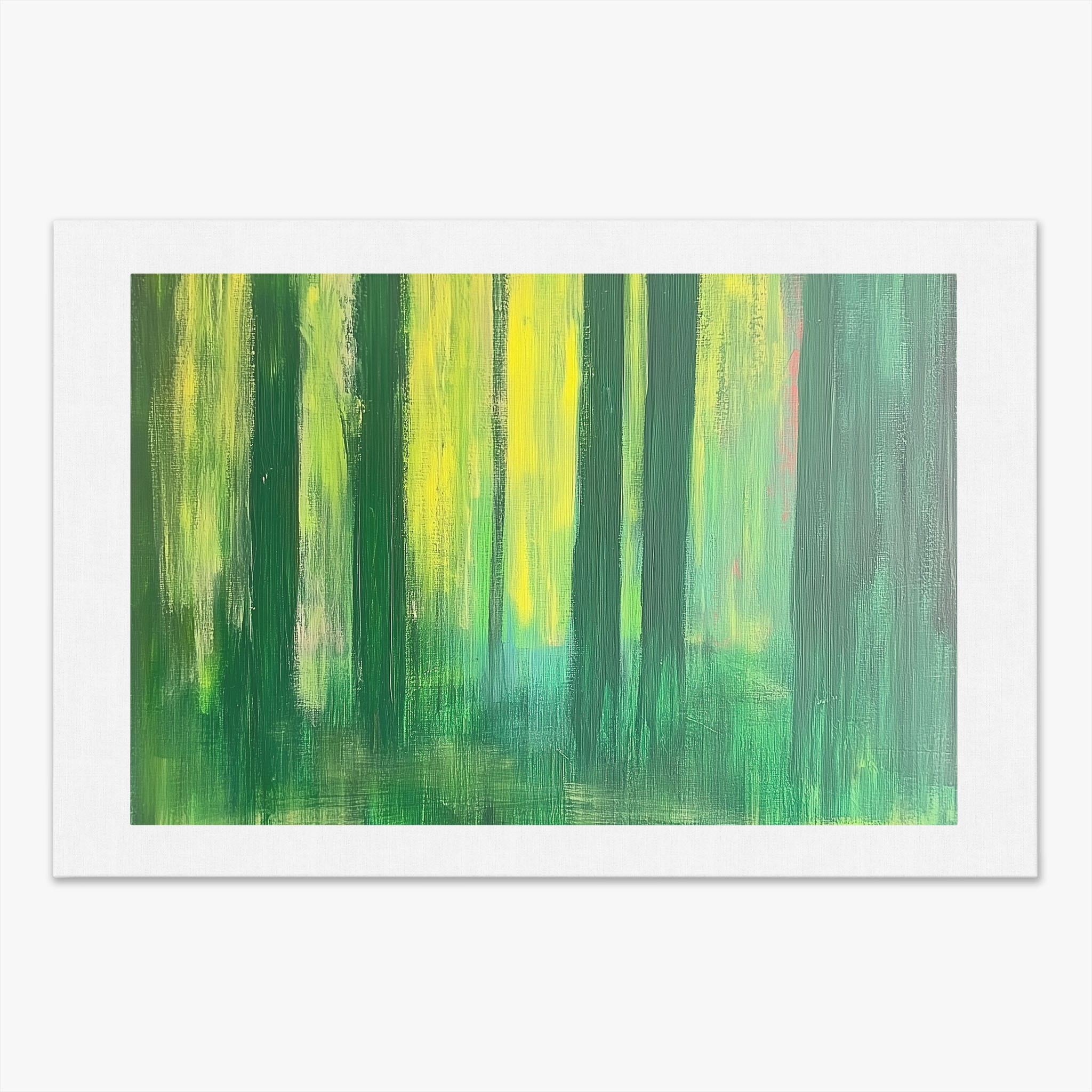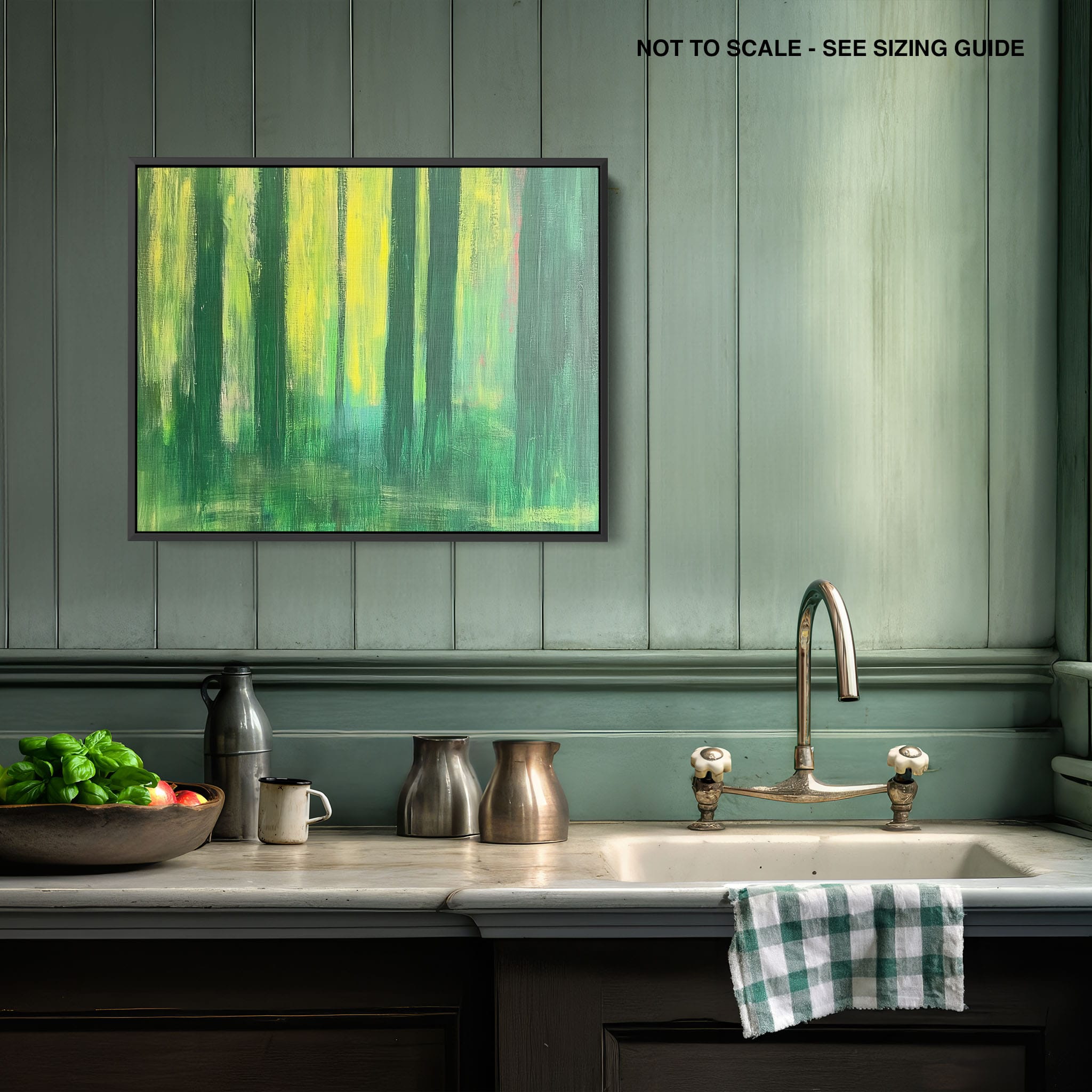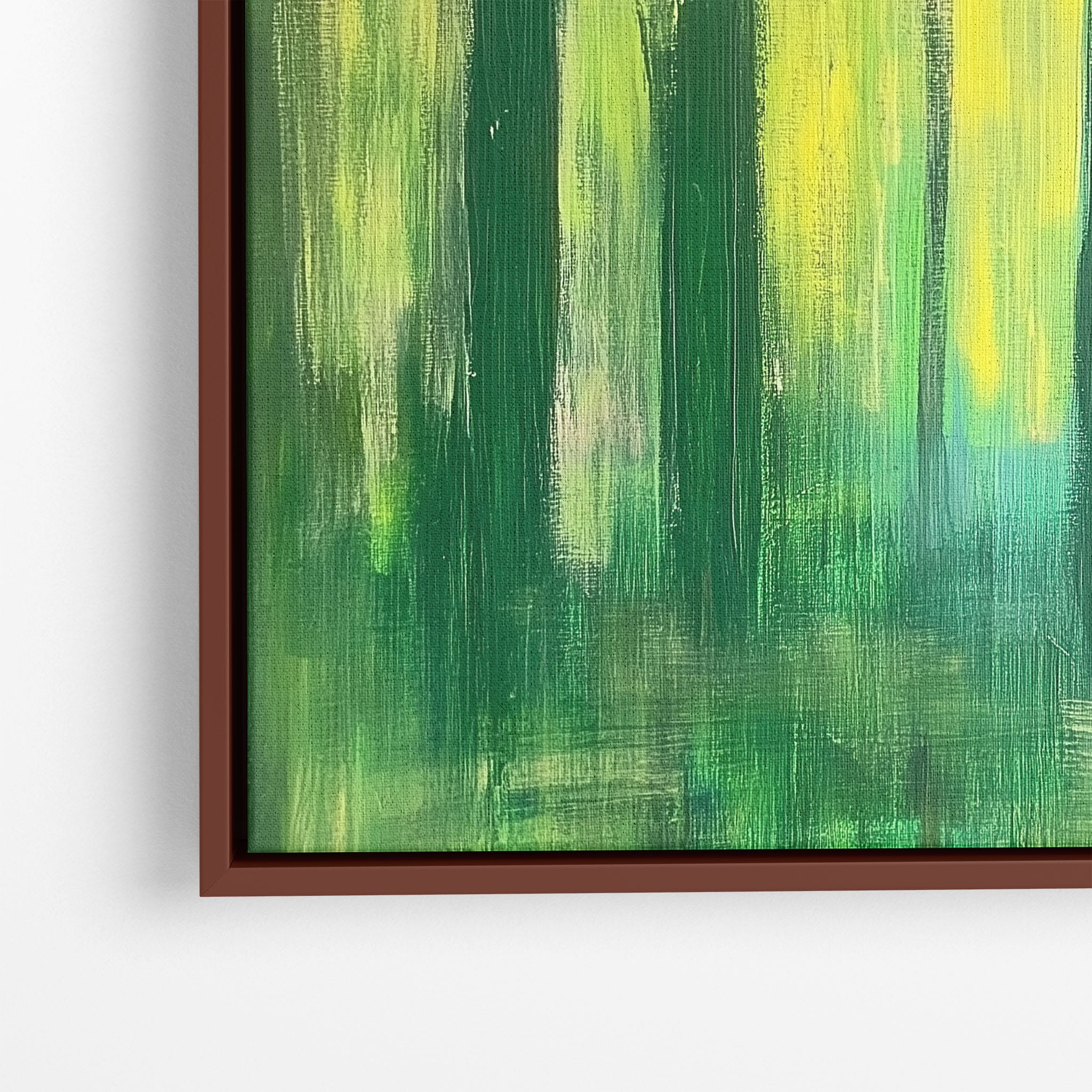 This painting captures the serene essence of a forest through bold strokes and vibrant shades of green. The abstract depiction uses impressionistic influences to evoke the varying light and shadows found within woodland realms. Its modern take on a natural landscape makes it ideal for any space that seeks a touch of tranquility paired with contemporary artistic flair. Add this piece to your décor to bring a fresh, lively energy to any room. Perfect for art lovers seeking a blend of environmental beauty and abstract artistry in their home or office.