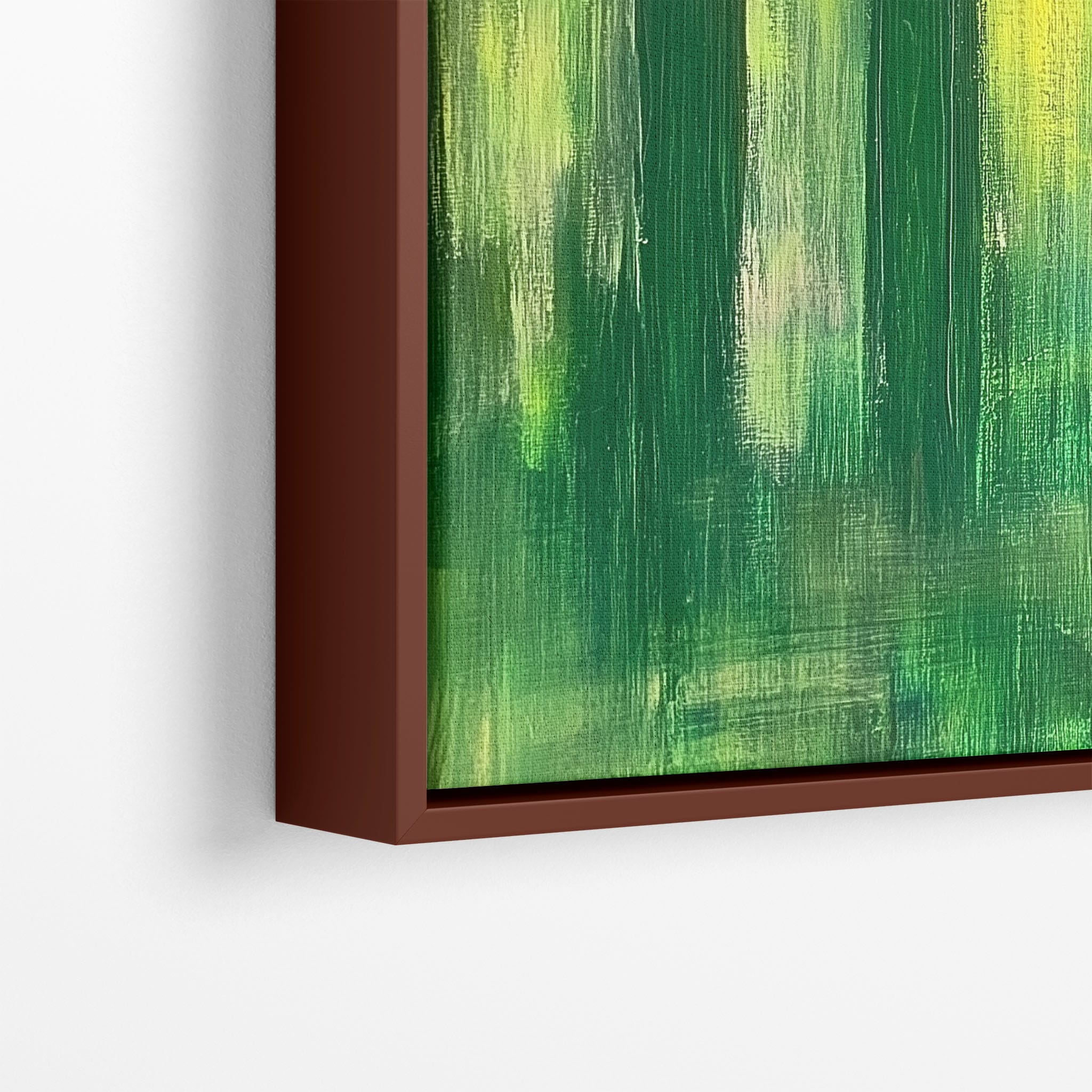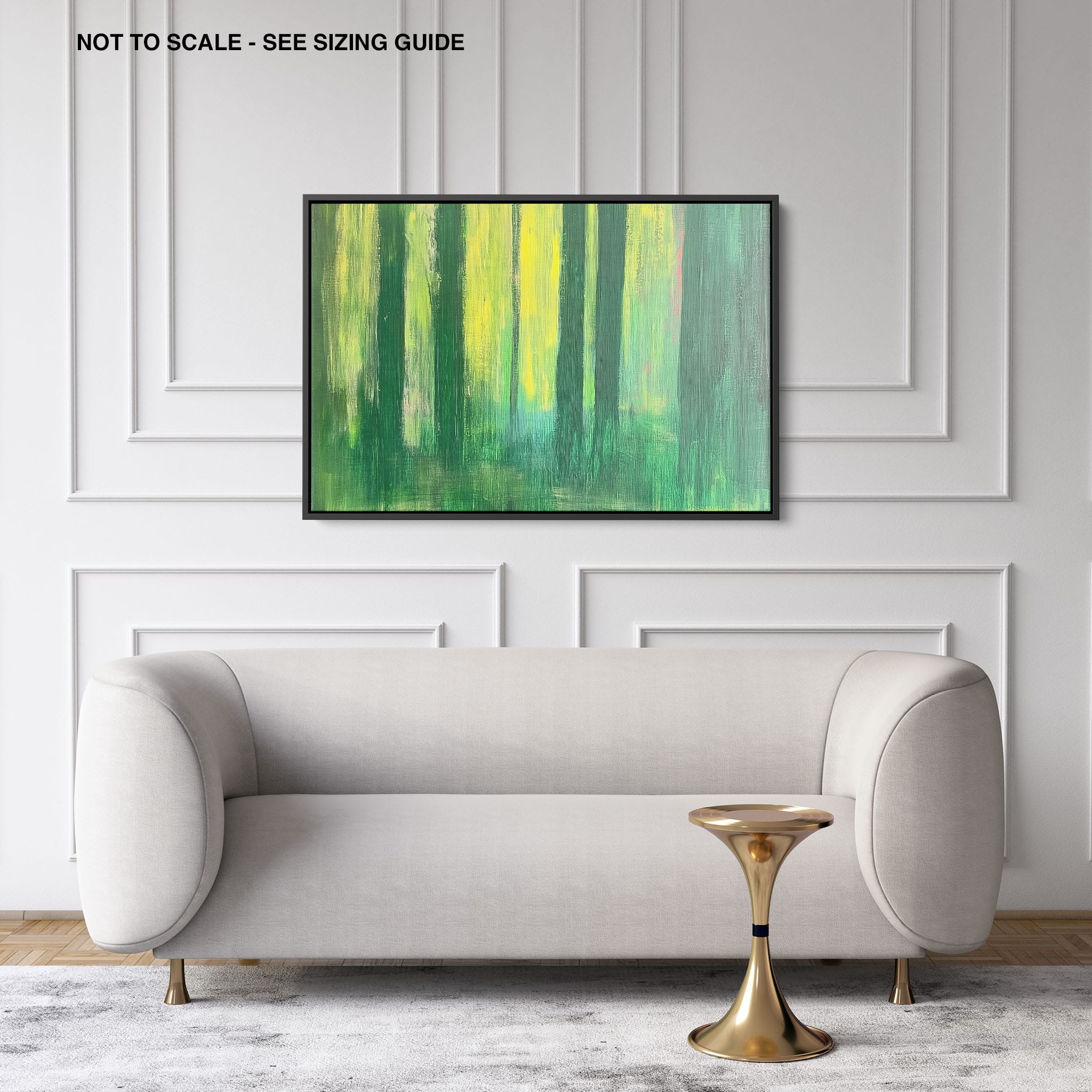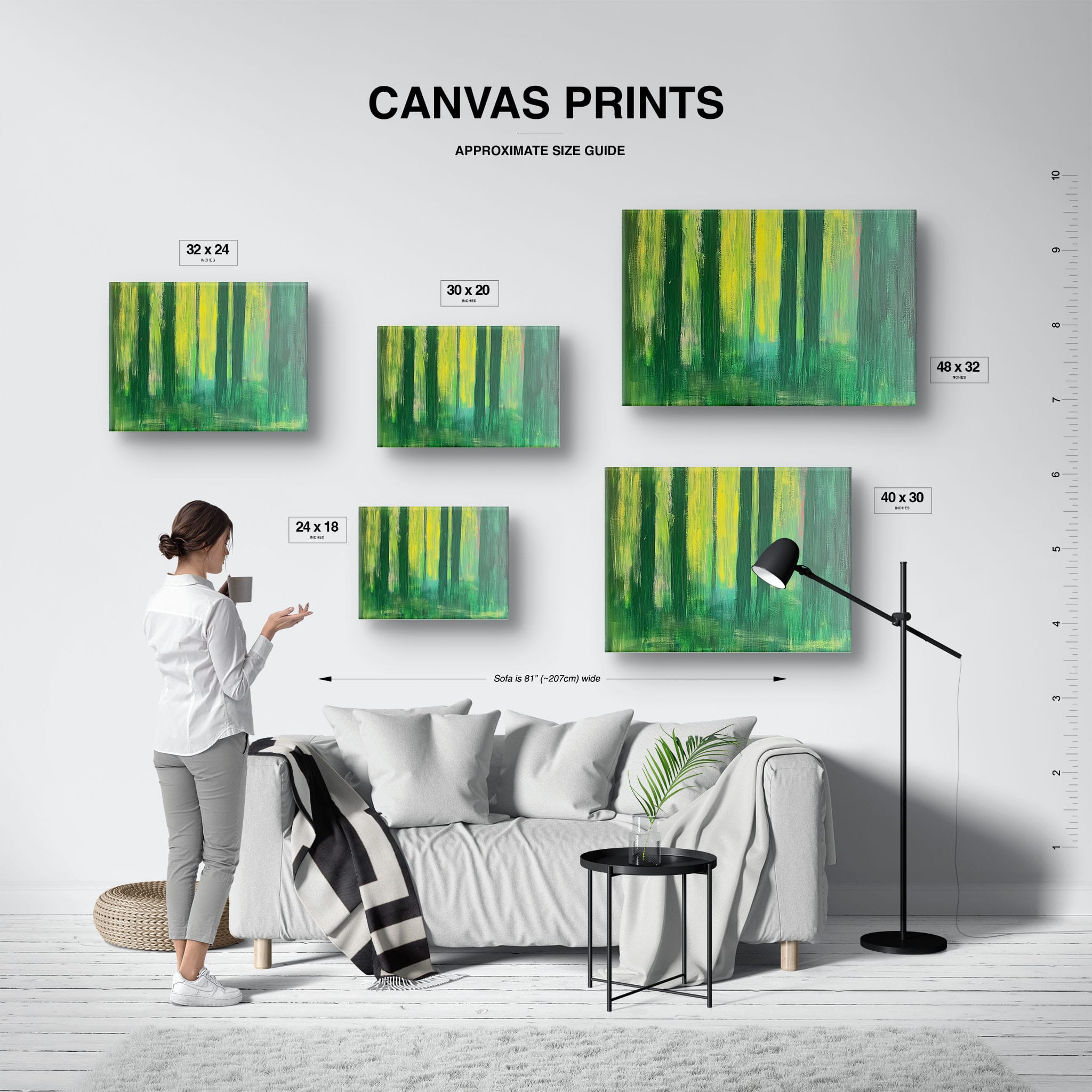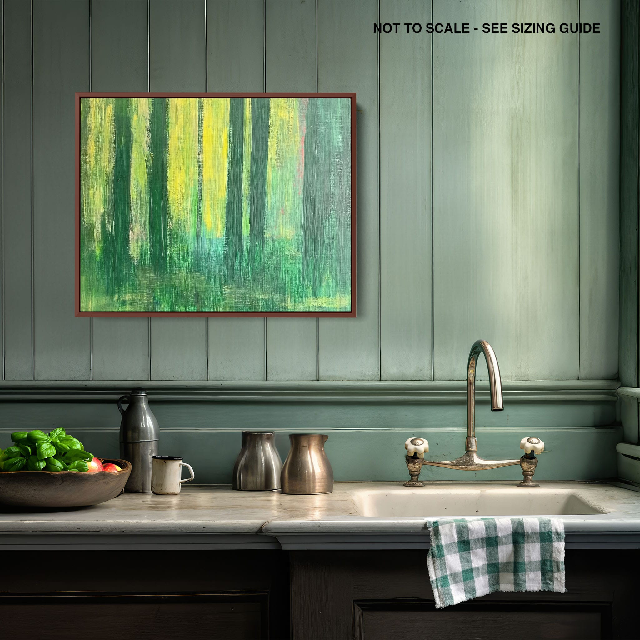 This painting captures the serene essence of a forest through bold strokes and vibrant shades of green. The abstract depiction uses impressionistic influences to evoke the varying light and shadows found within woodland realms. Its modern take on a natural landscape makes it ideal for any space that seeks a touch of tranquility paired with contemporary artistic flair. Add this piece to your décor to bring a fresh, lively energy to any room. Perfect for art lovers seeking a blend of environmental beauty and abstract artistry in their home or office.