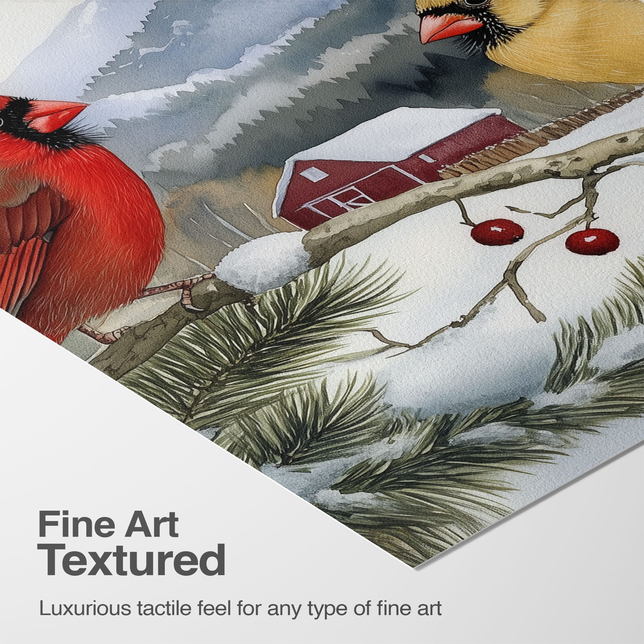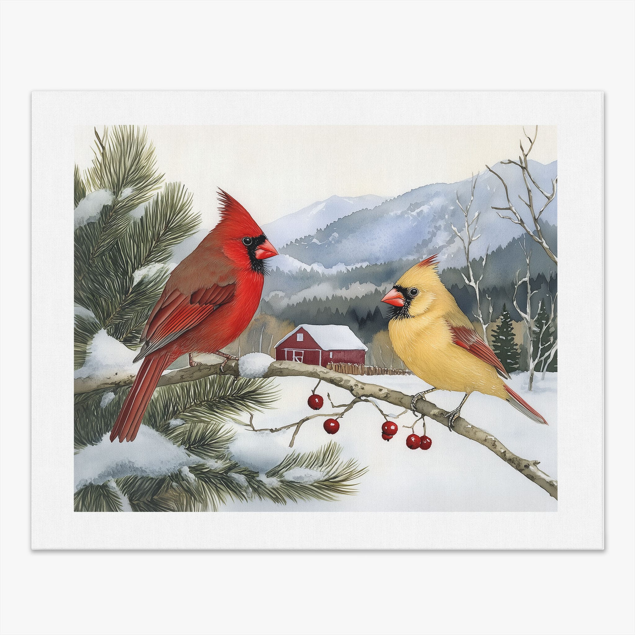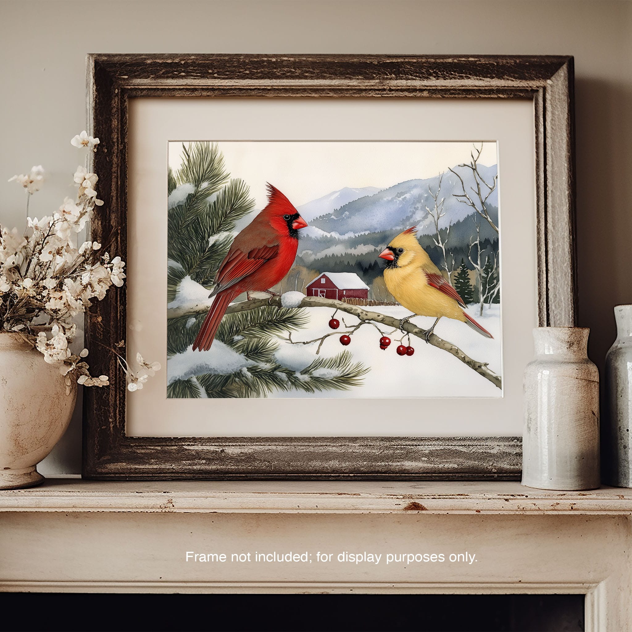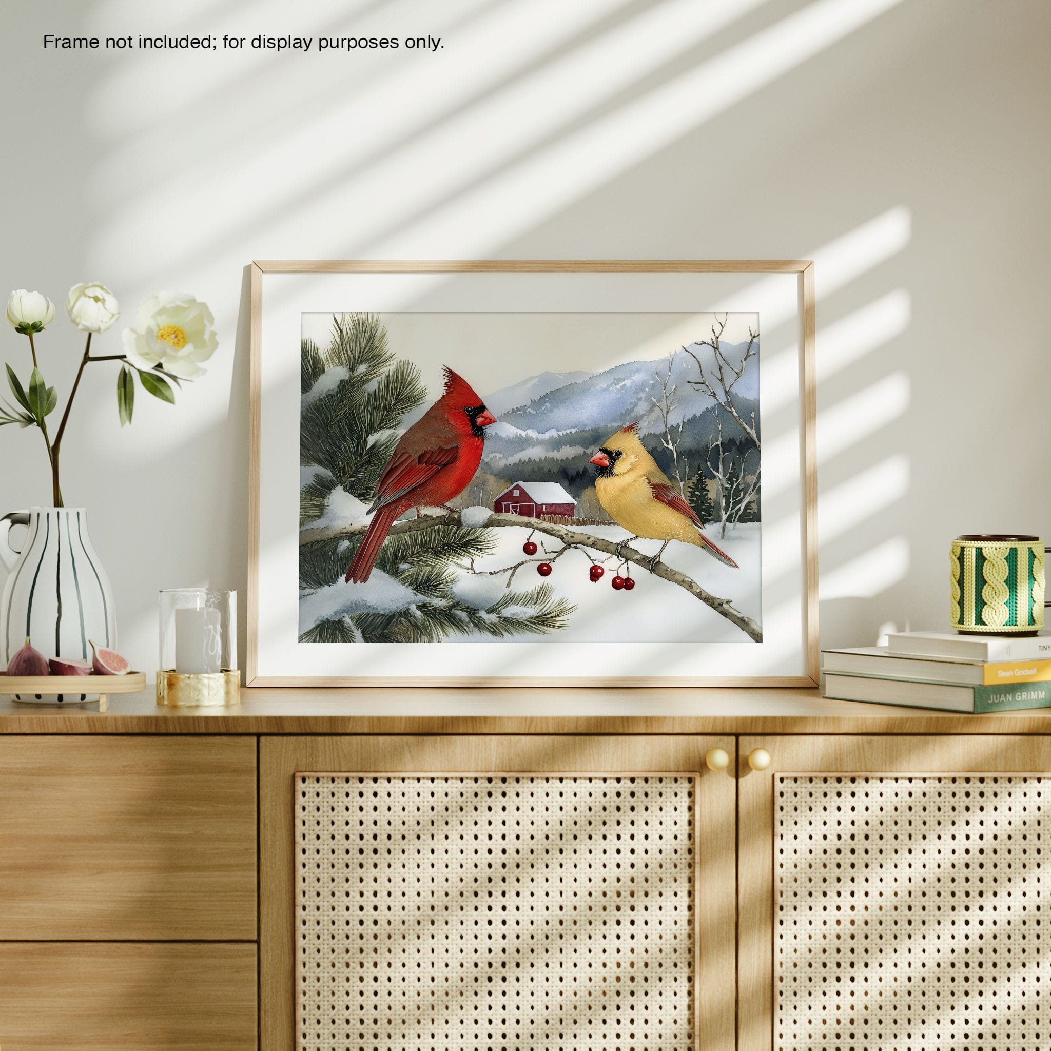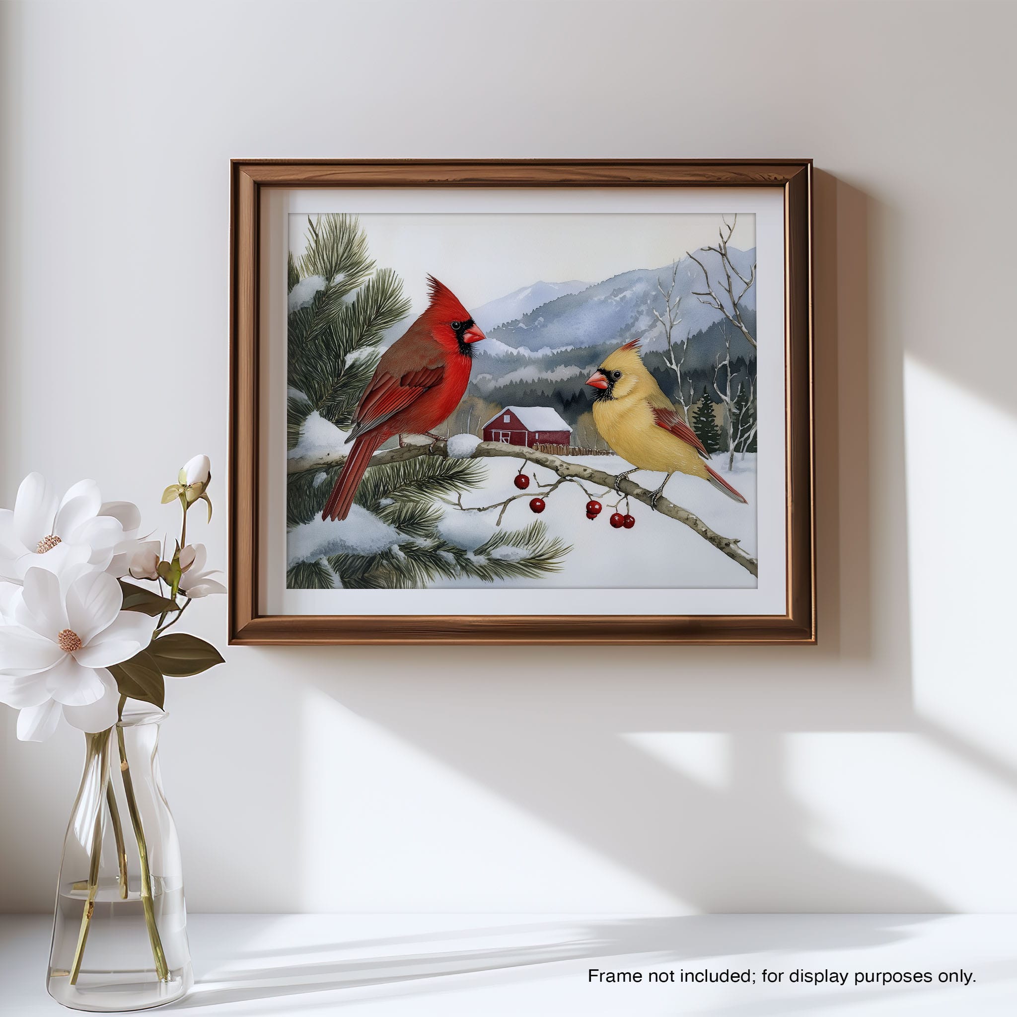 This serene digital watercolor piece captures a pair of cardinals resting on a snow-laden branch, their vibrant red and yellow plumage stark against a softly muted winter landscape. Set against a backdrop of distant mountains and evergreen forests, the artwork depicts a tranquil winter scene, invoking feelings of quiet and peace. The refined use of color and careful composition make it an ideal choice for enhancing any living space or office. An essential find for those who appreciate the beauty of nature and the charm of digital watercolor, this artwork promises to bring a touch of winter's serene elegance indoors.