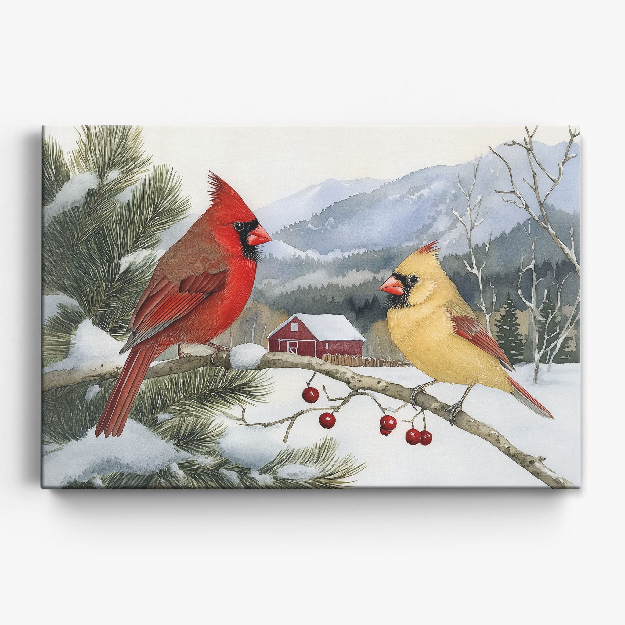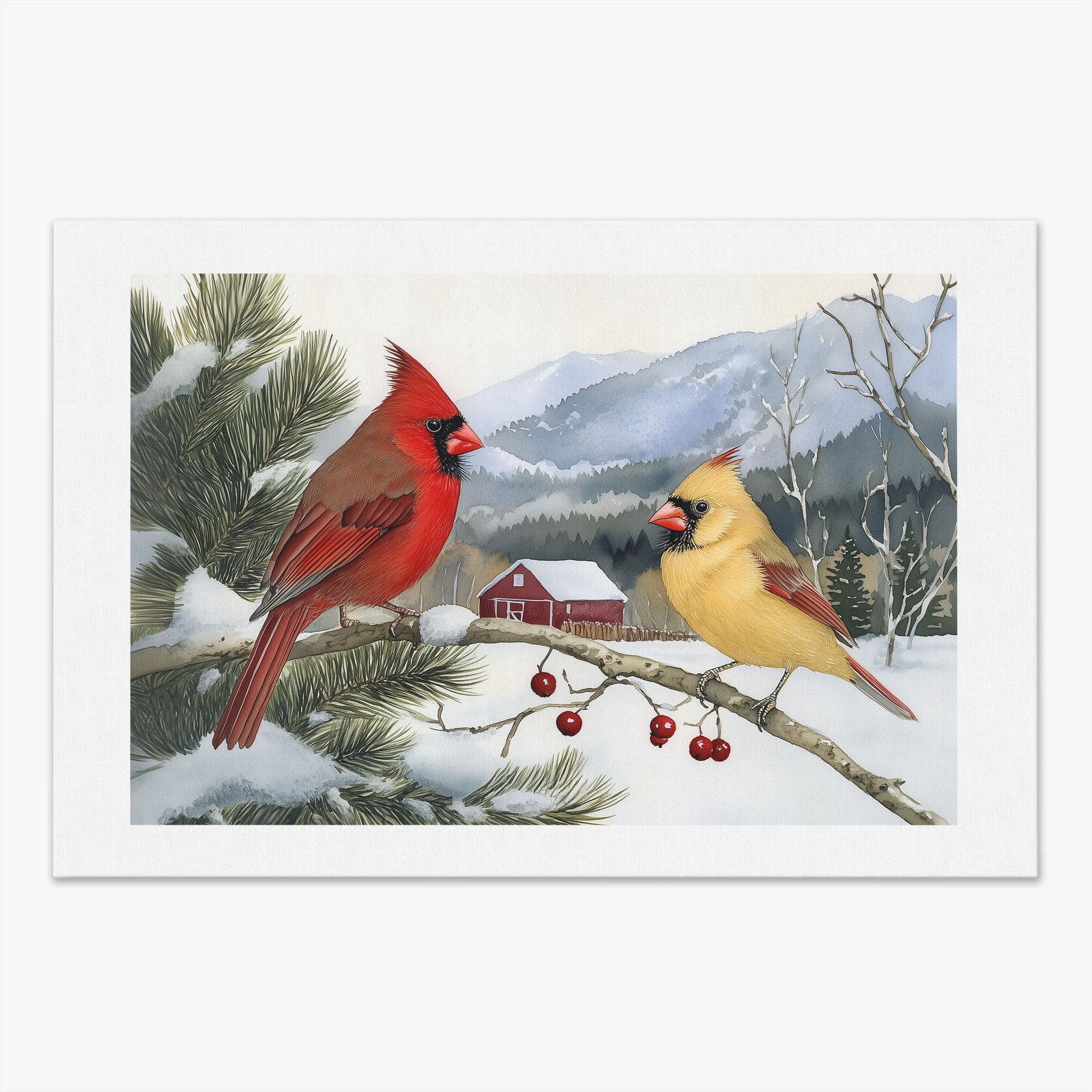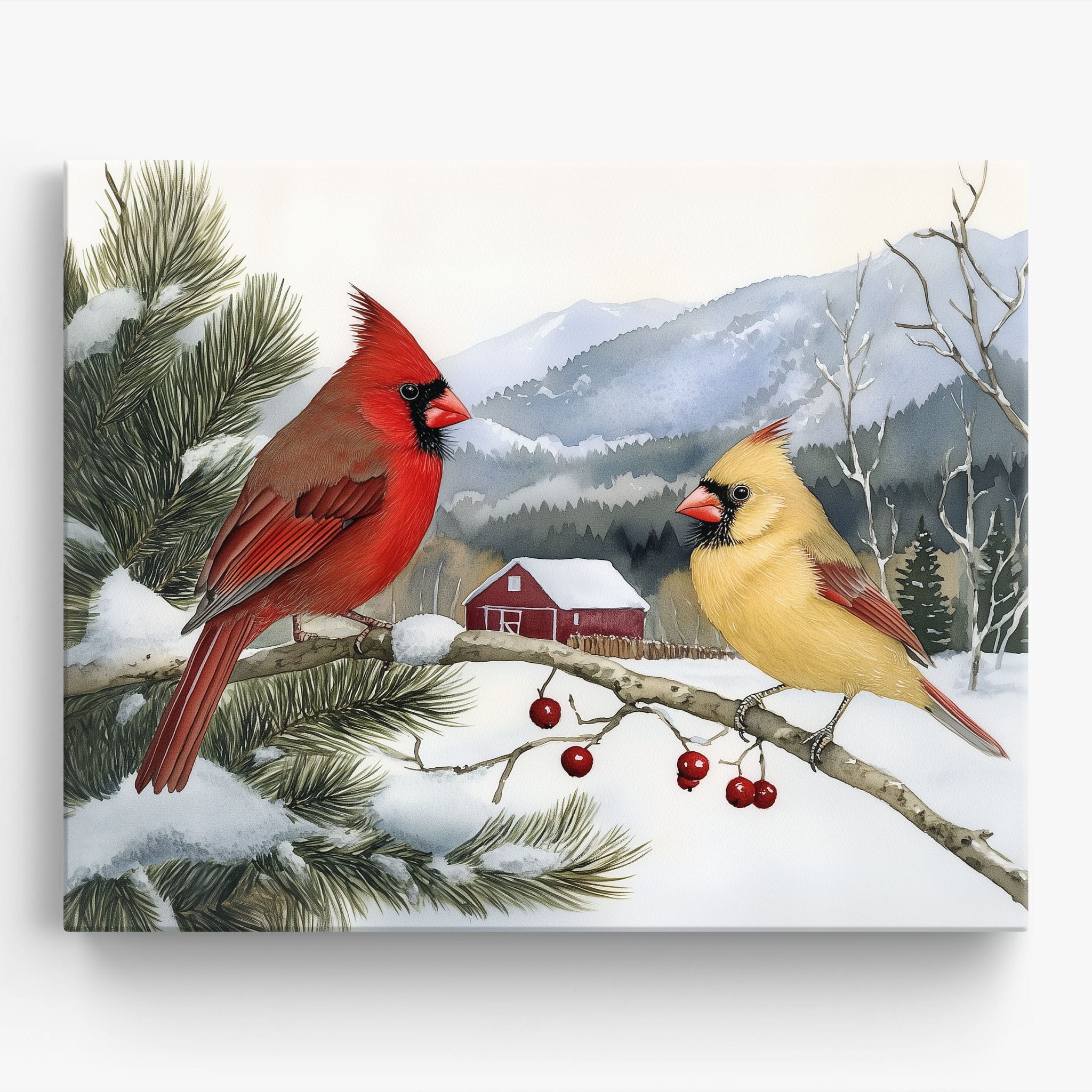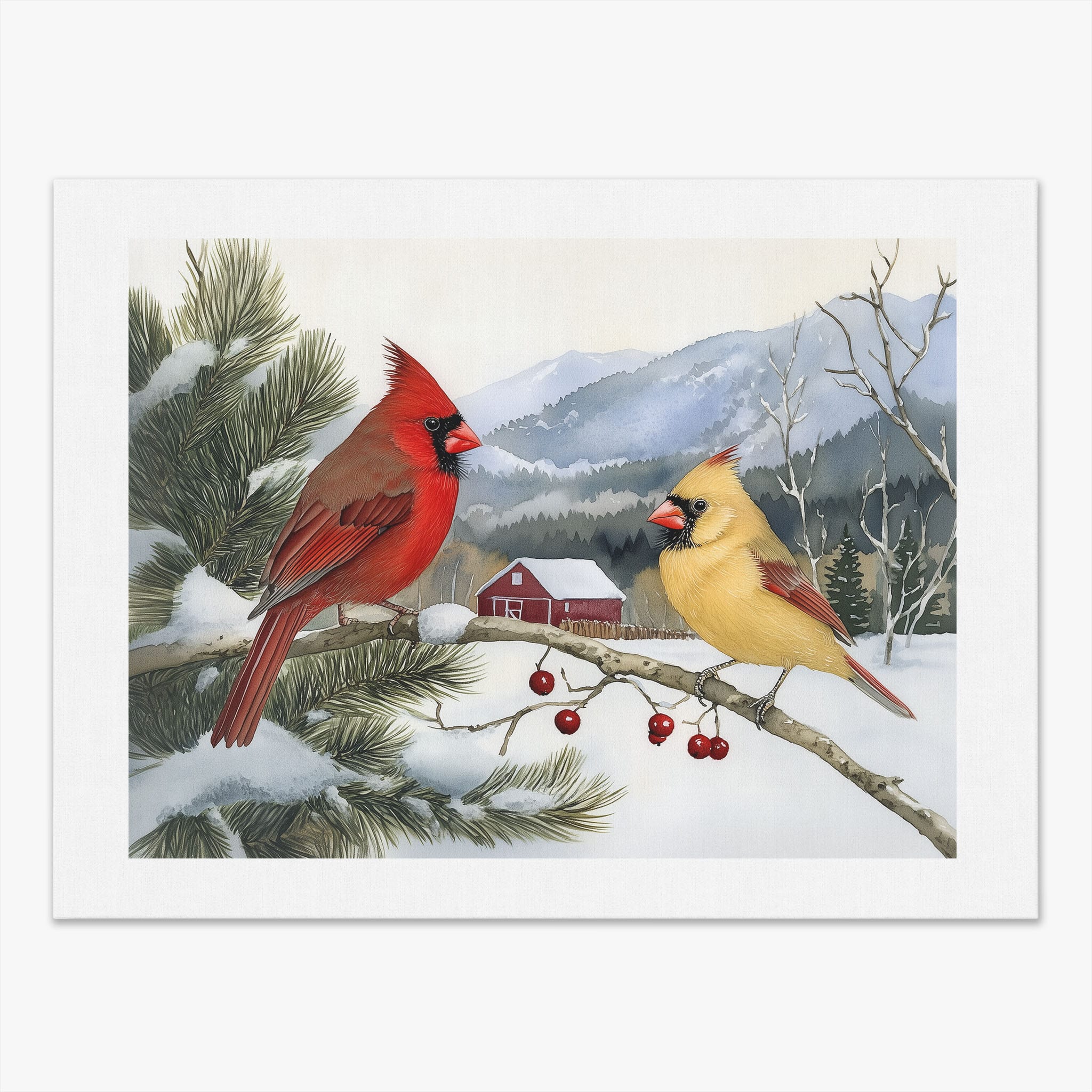 This serene digital watercolor piece captures a pair of cardinals resting on a snow-laden branch, their vibrant red and yellow plumage stark against a softly muted winter landscape. Set against a backdrop of distant mountains and evergreen forests, the artwork depicts a tranquil winter scene, invoking feelings of quiet and peace. The refined use of color and careful composition make it an ideal choice for enhancing any living space or office. An essential find for those who appreciate the beauty of nature and the charm of digital watercolor, this artwork promises to bring a touch of winter's serene elegance indoors.