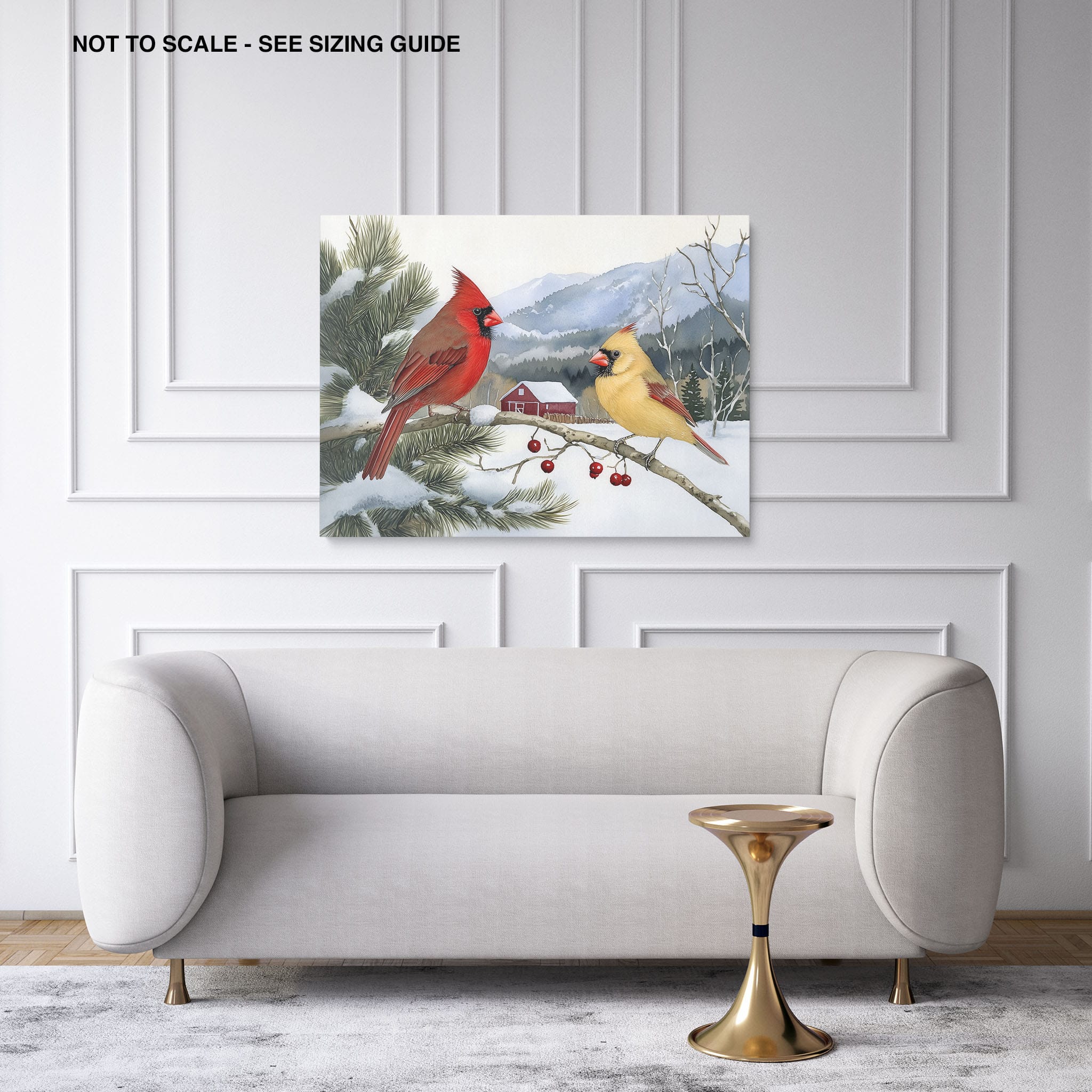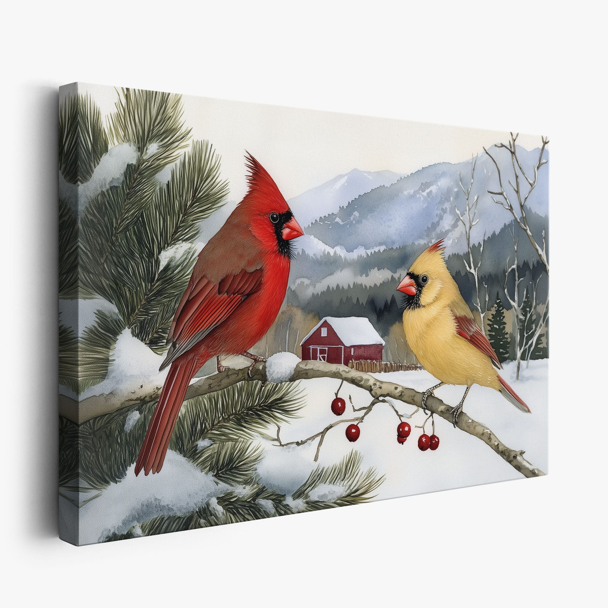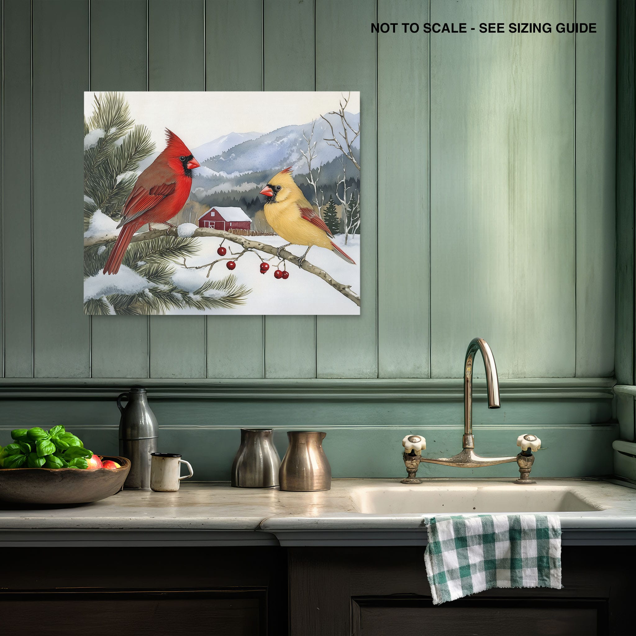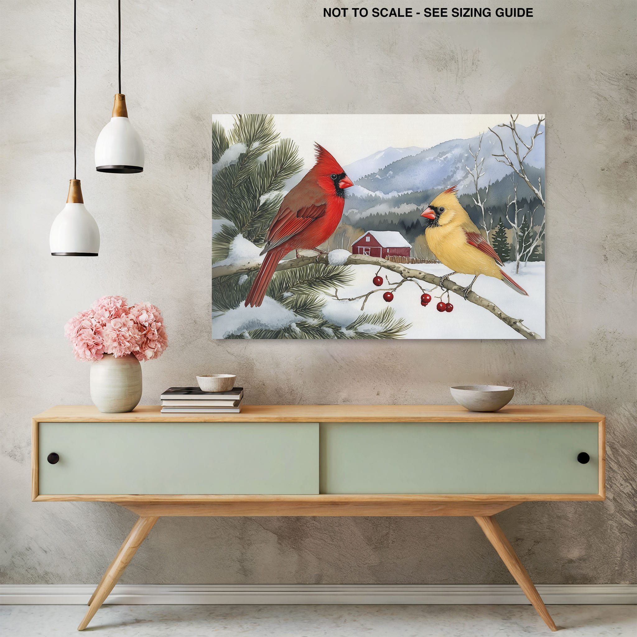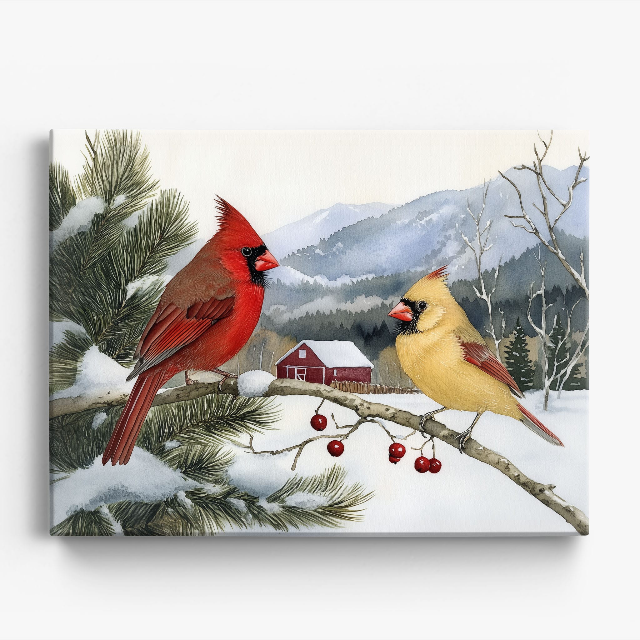 This serene digital watercolor piece captures a pair of cardinals resting on a snow-laden branch, their vibrant red and yellow plumage stark against a softly muted winter landscape. Set against a backdrop of distant mountains and evergreen forests, the artwork depicts a tranquil winter scene, invoking feelings of quiet and peace. The refined use of color and careful composition make it an ideal choice for enhancing any living space or office. An essential find for those who appreciate the beauty of nature and the charm of digital watercolor, this artwork promises to bring a touch of winter's serene elegance indoors.