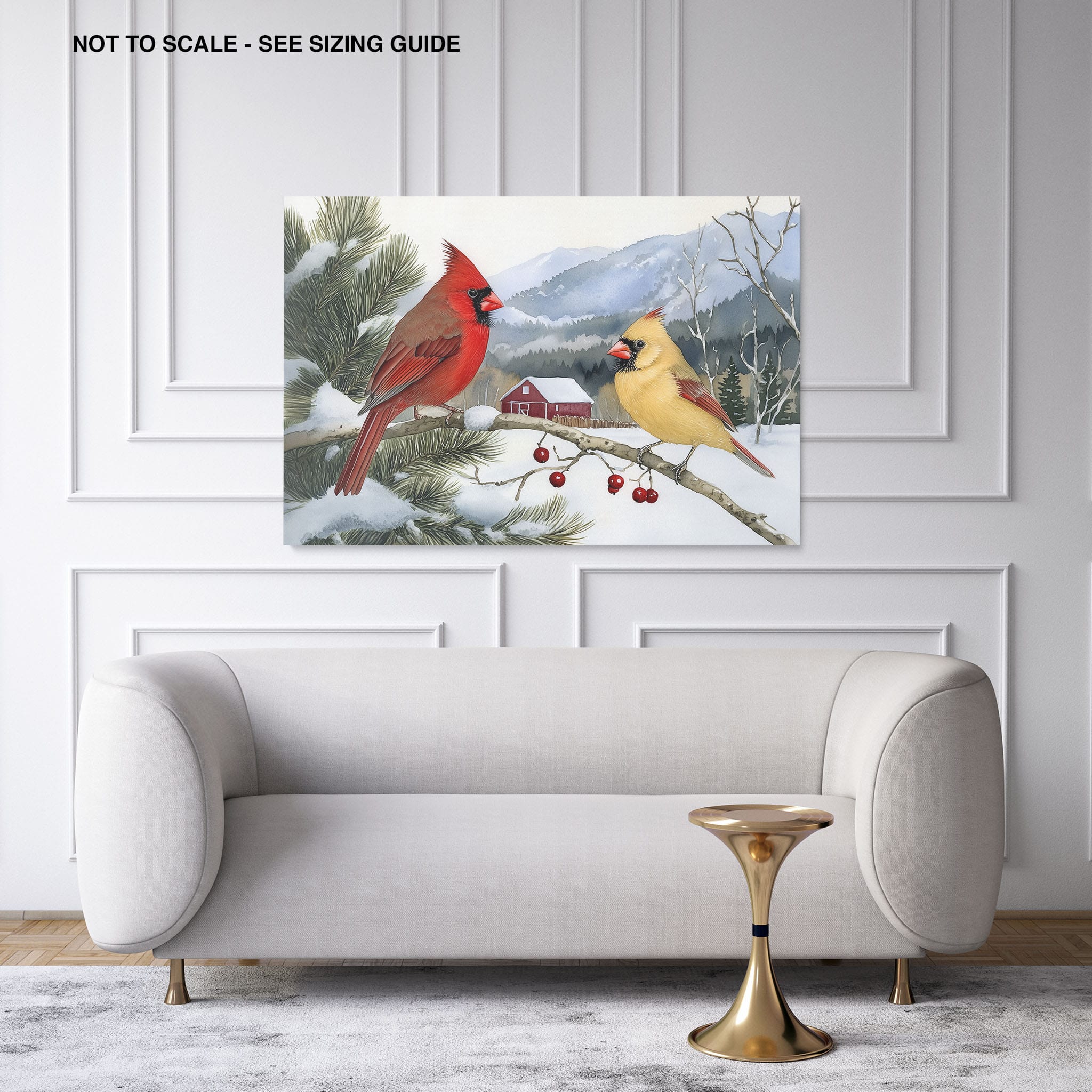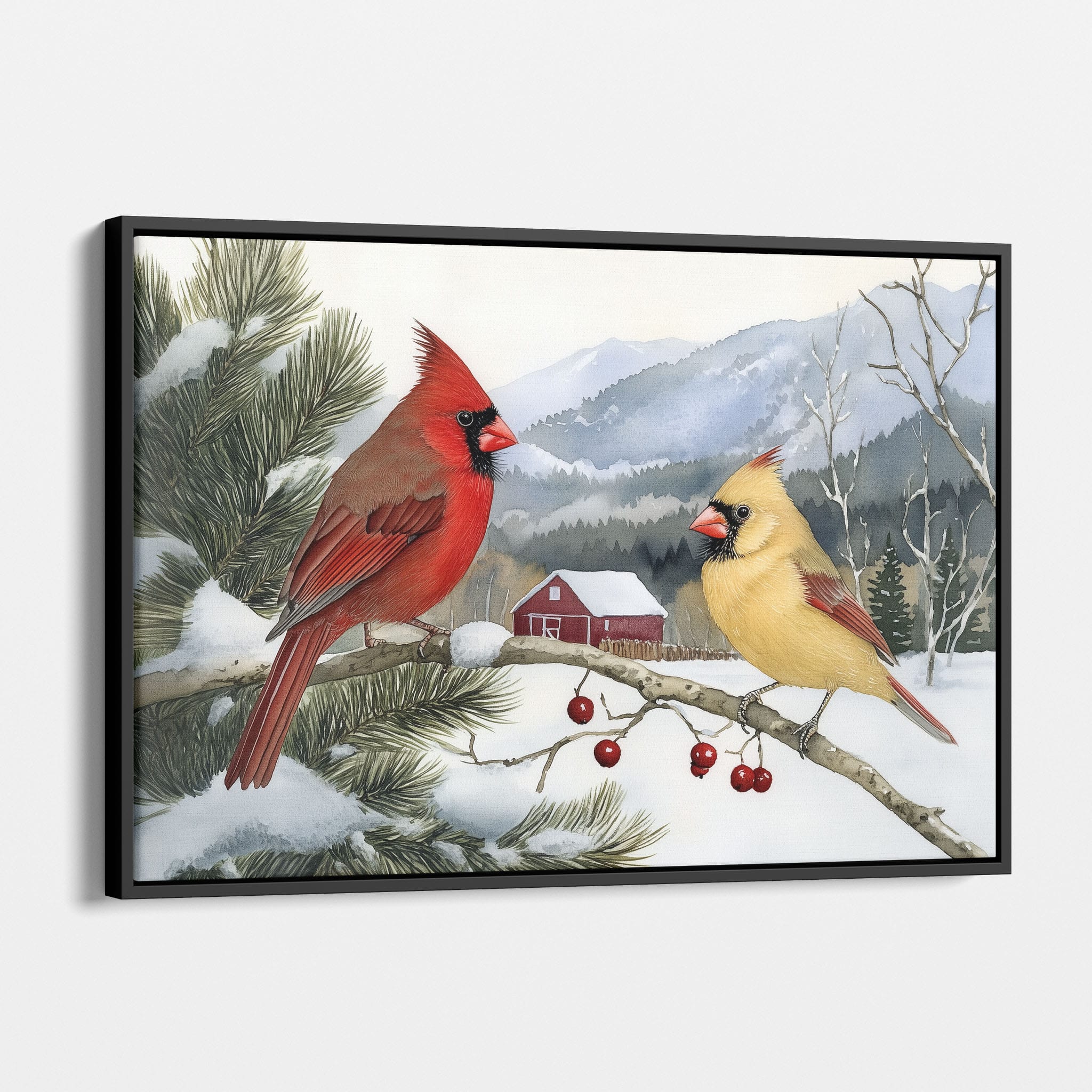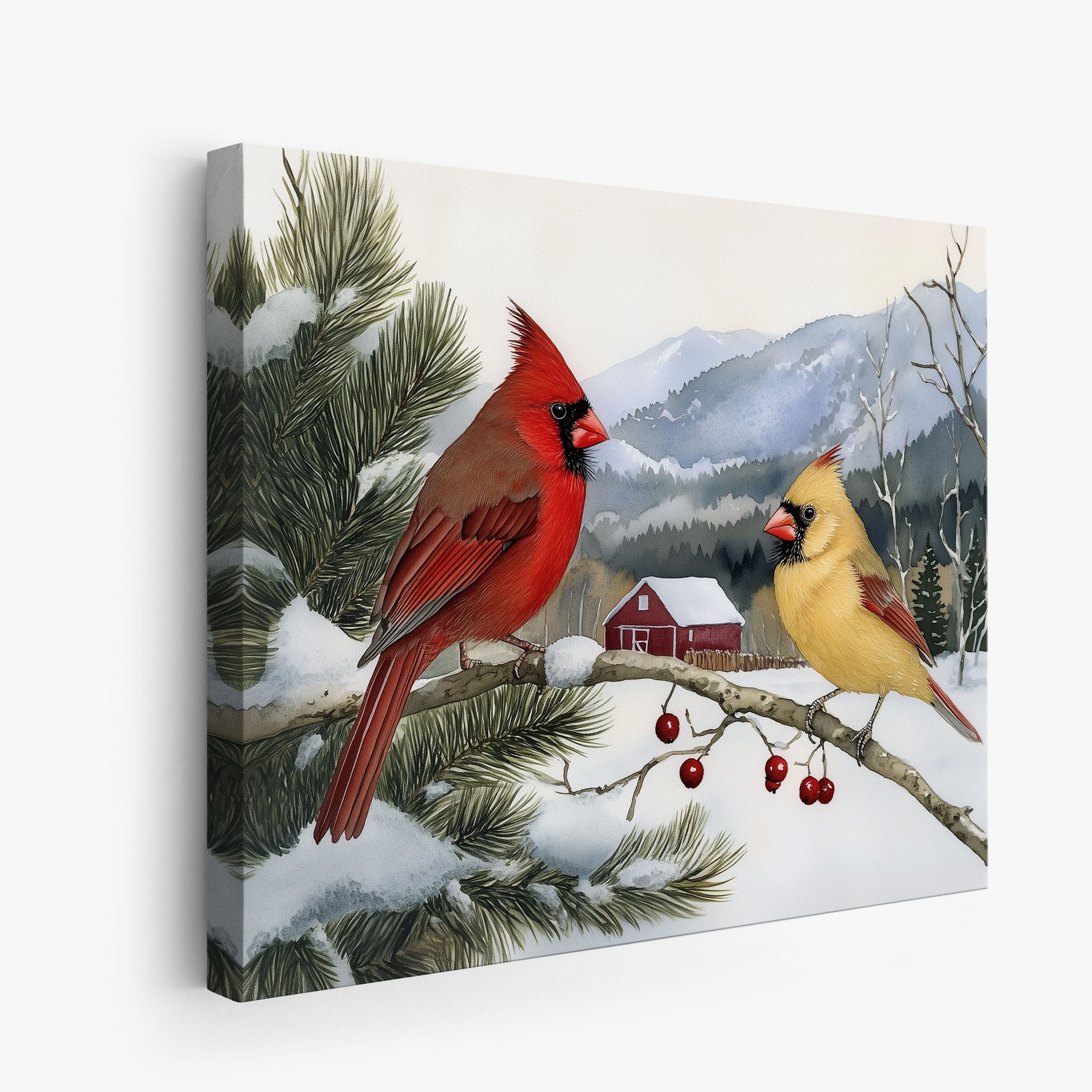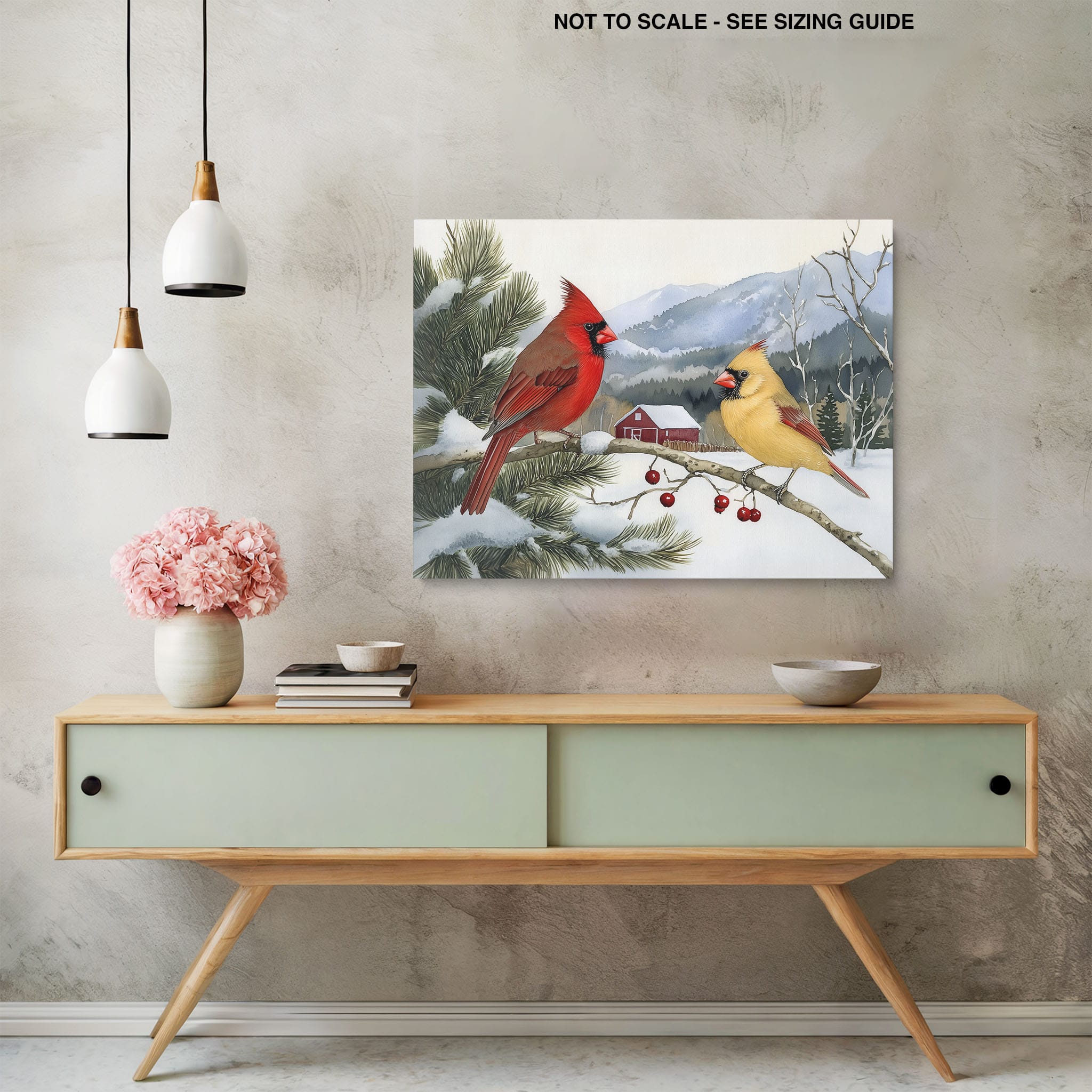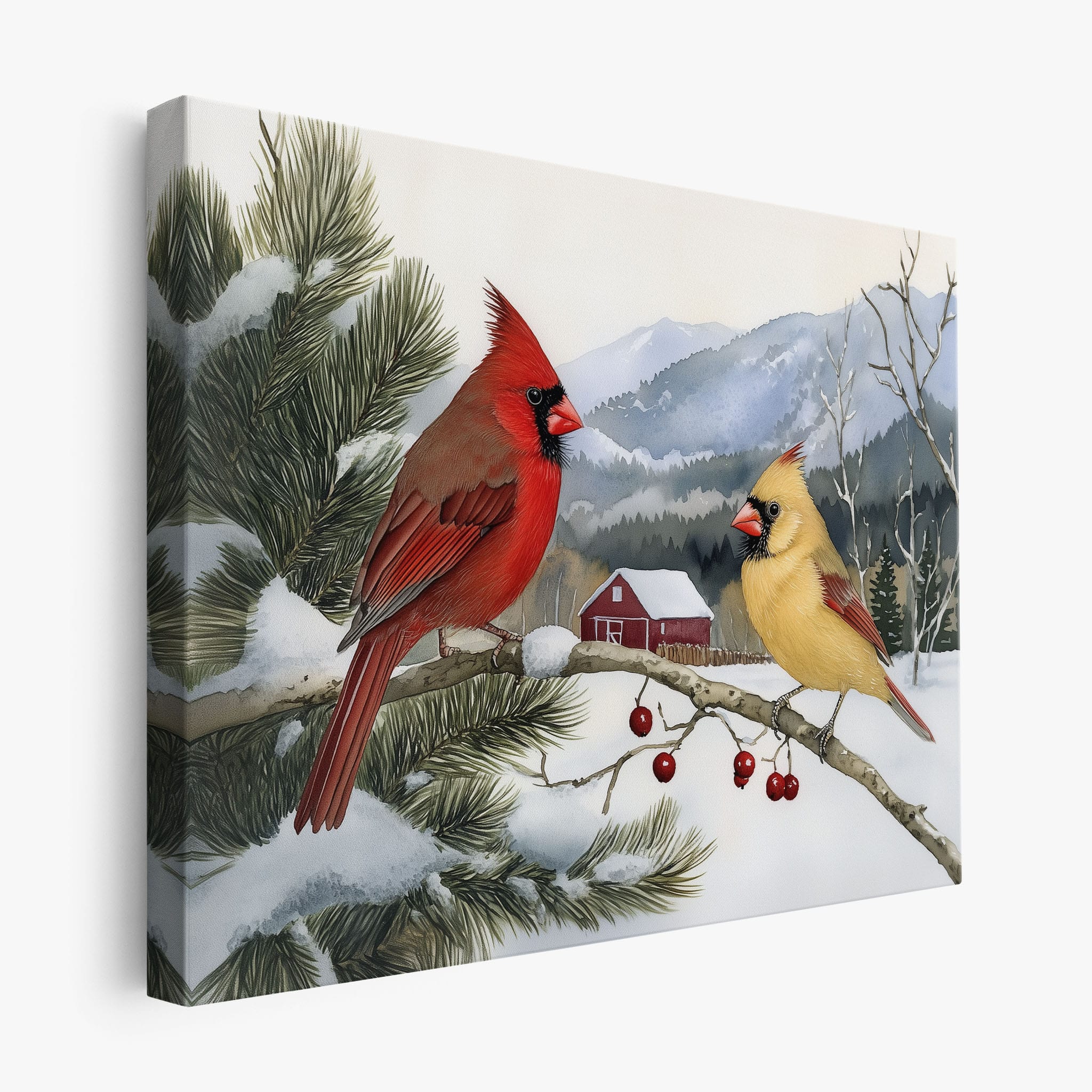 This serene digital watercolor piece captures a pair of cardinals resting on a snow-laden branch, their vibrant red and yellow plumage stark against a softly muted winter landscape. Set against a backdrop of distant mountains and evergreen forests, the artwork depicts a tranquil winter scene, invoking feelings of quiet and peace. The refined use of color and careful composition make it an ideal choice for enhancing any living space or office. An essential find for those who appreciate the beauty of nature and the charm of digital watercolor, this artwork promises to bring a touch of winter's serene elegance indoors.