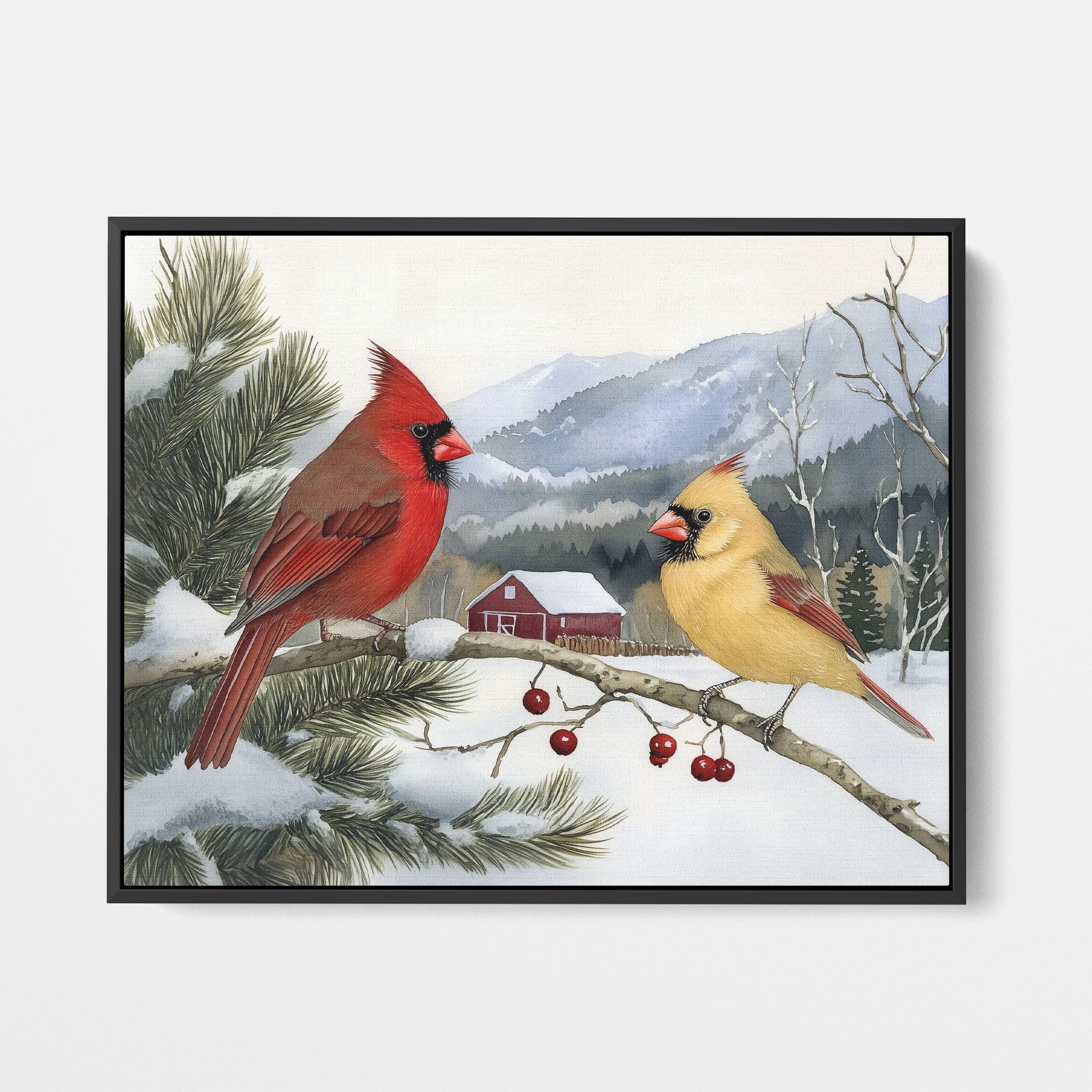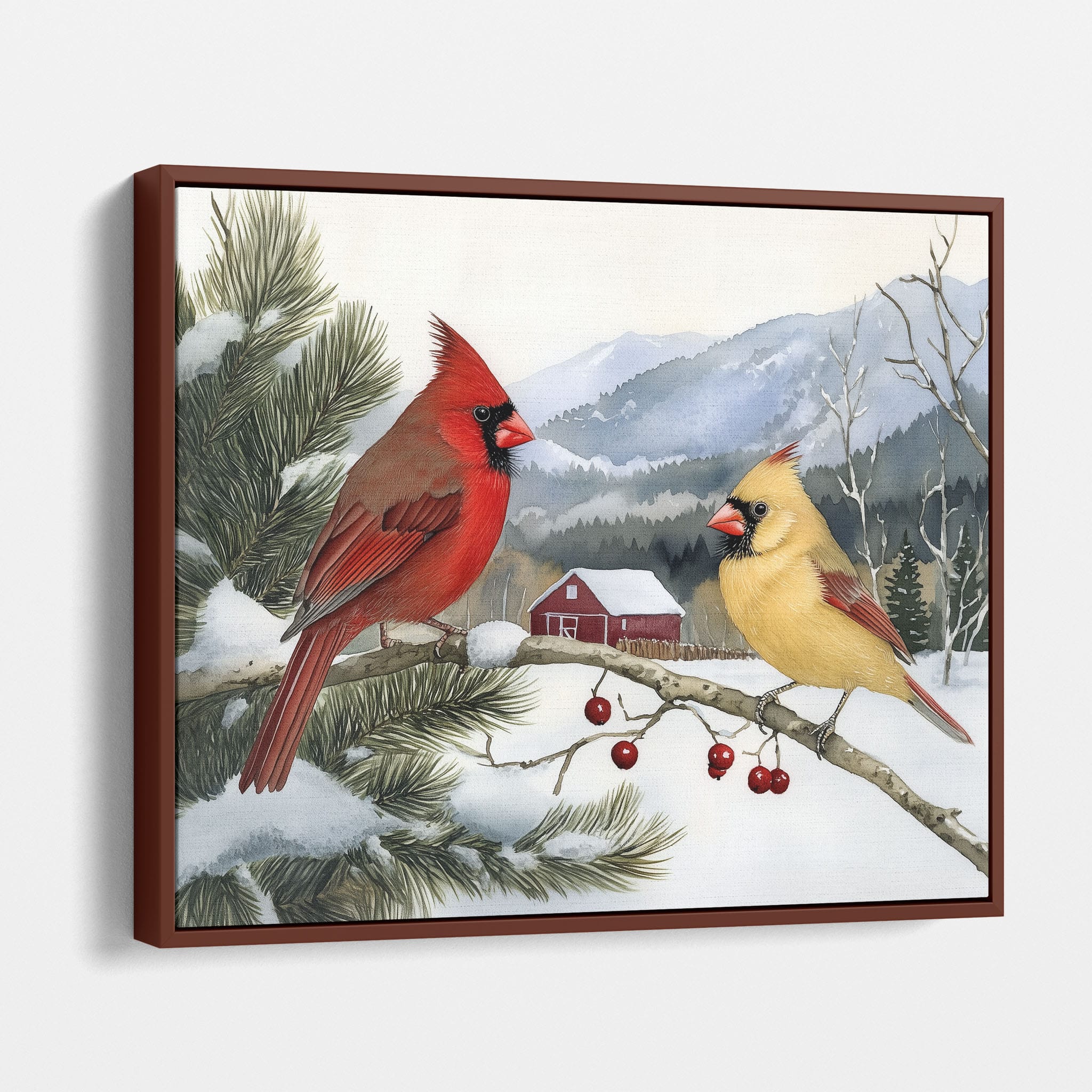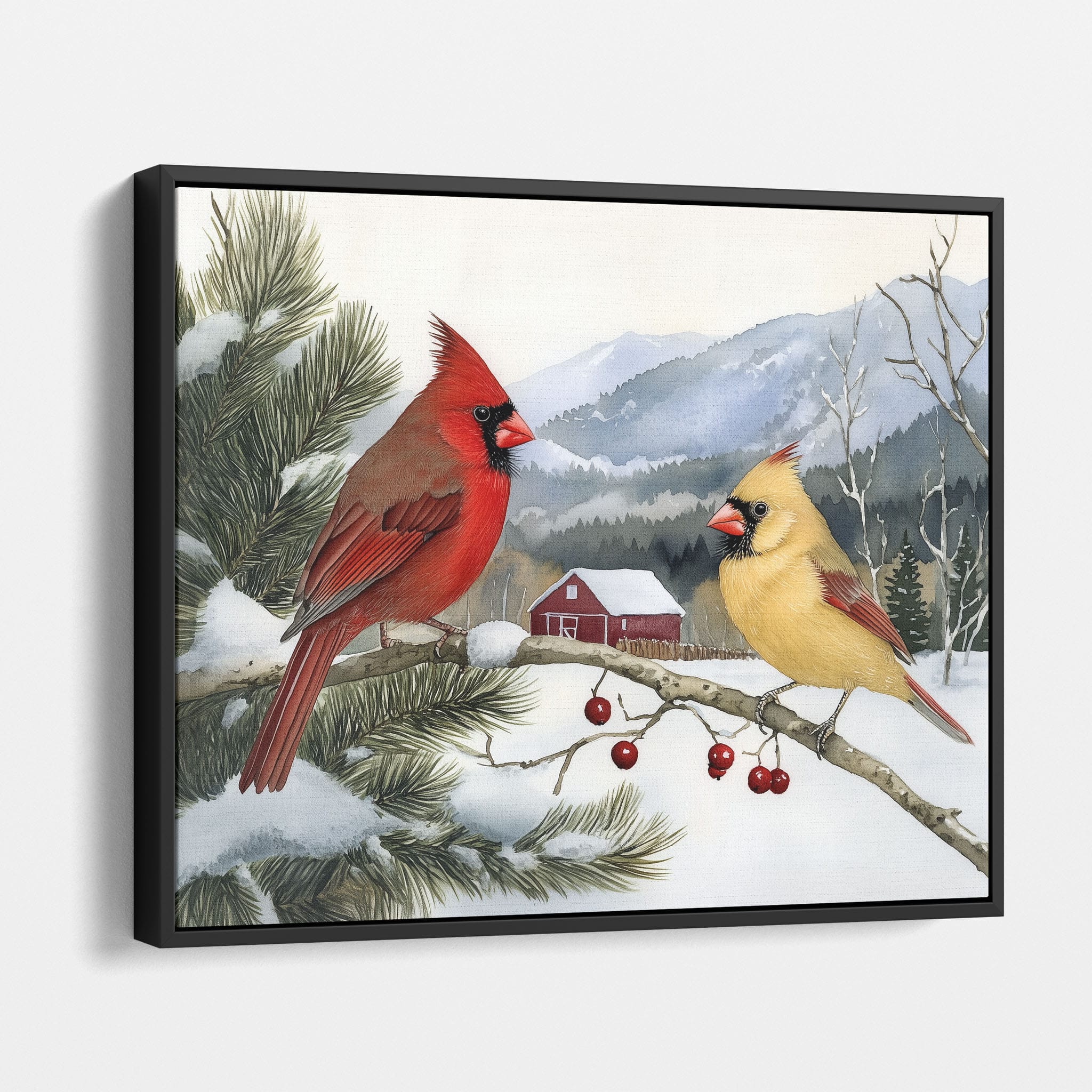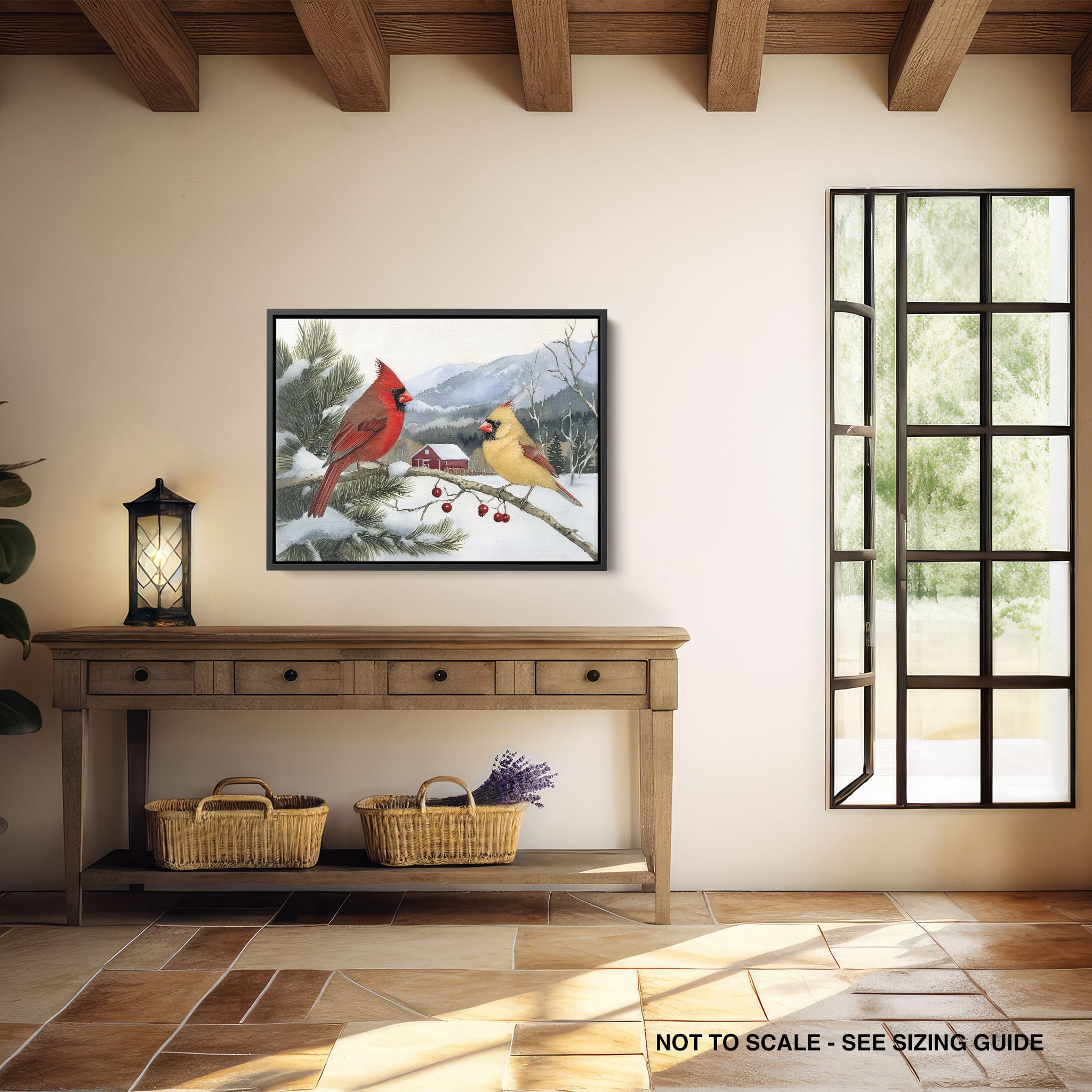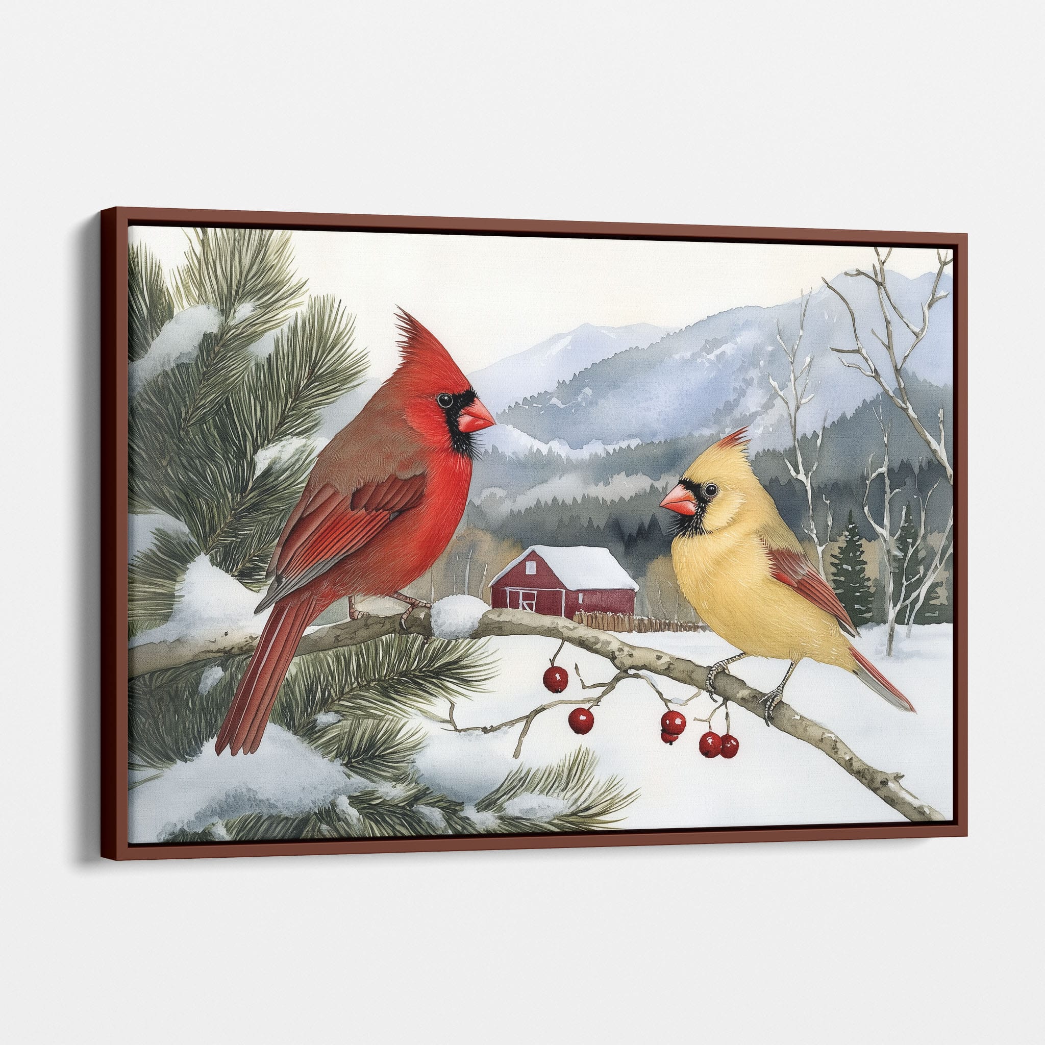 This serene digital watercolor piece captures a pair of cardinals resting on a snow-laden branch, their vibrant red and yellow plumage stark against a softly muted winter landscape. Set against a backdrop of distant mountains and evergreen forests, the artwork depicts a tranquil winter scene, invoking feelings of quiet and peace. The refined use of color and careful composition make it an ideal choice for enhancing any living space or office. An essential find for those who appreciate the beauty of nature and the charm of digital watercolor, this artwork promises to bring a touch of winter's serene elegance indoors.