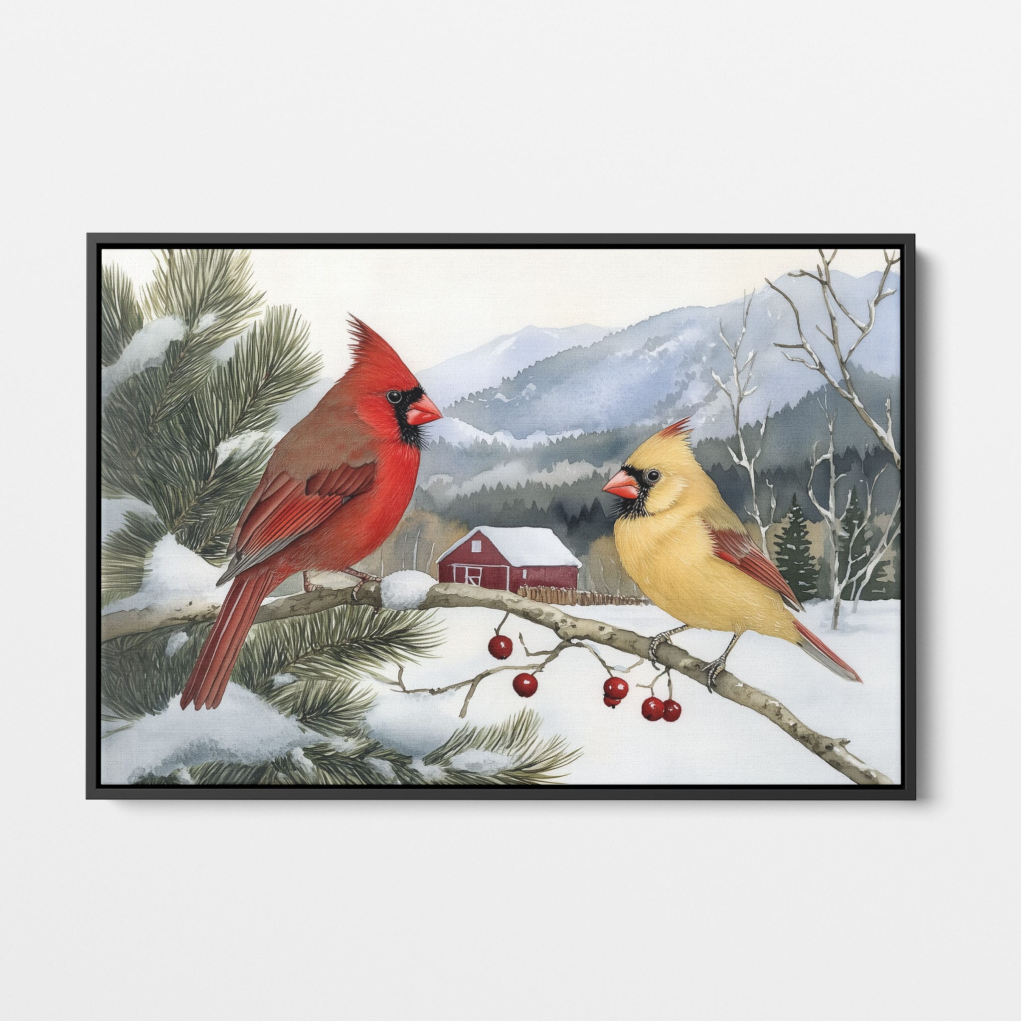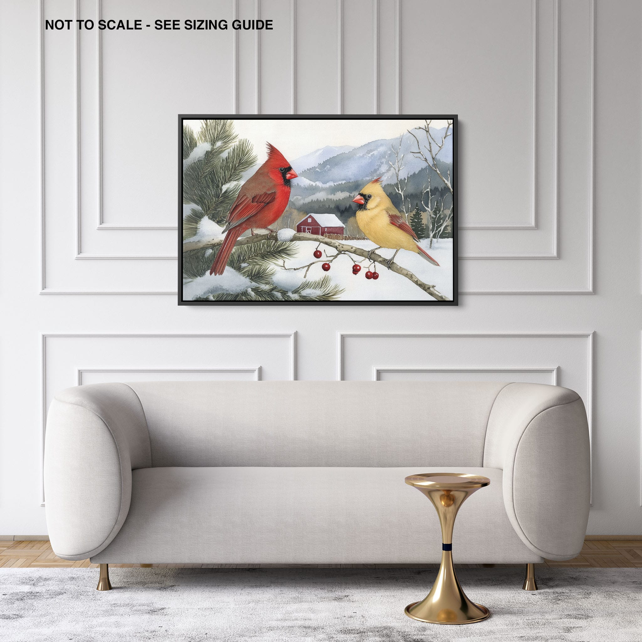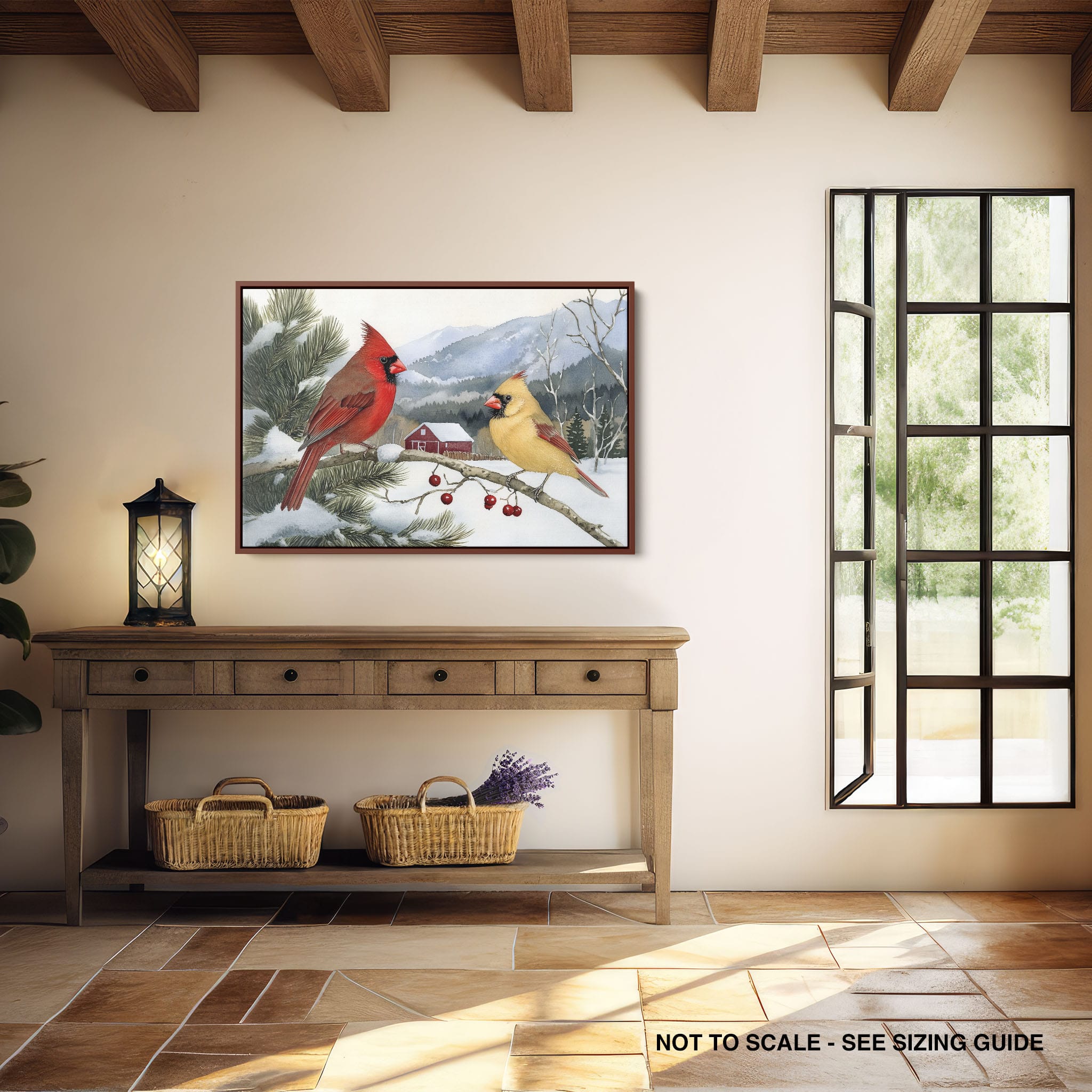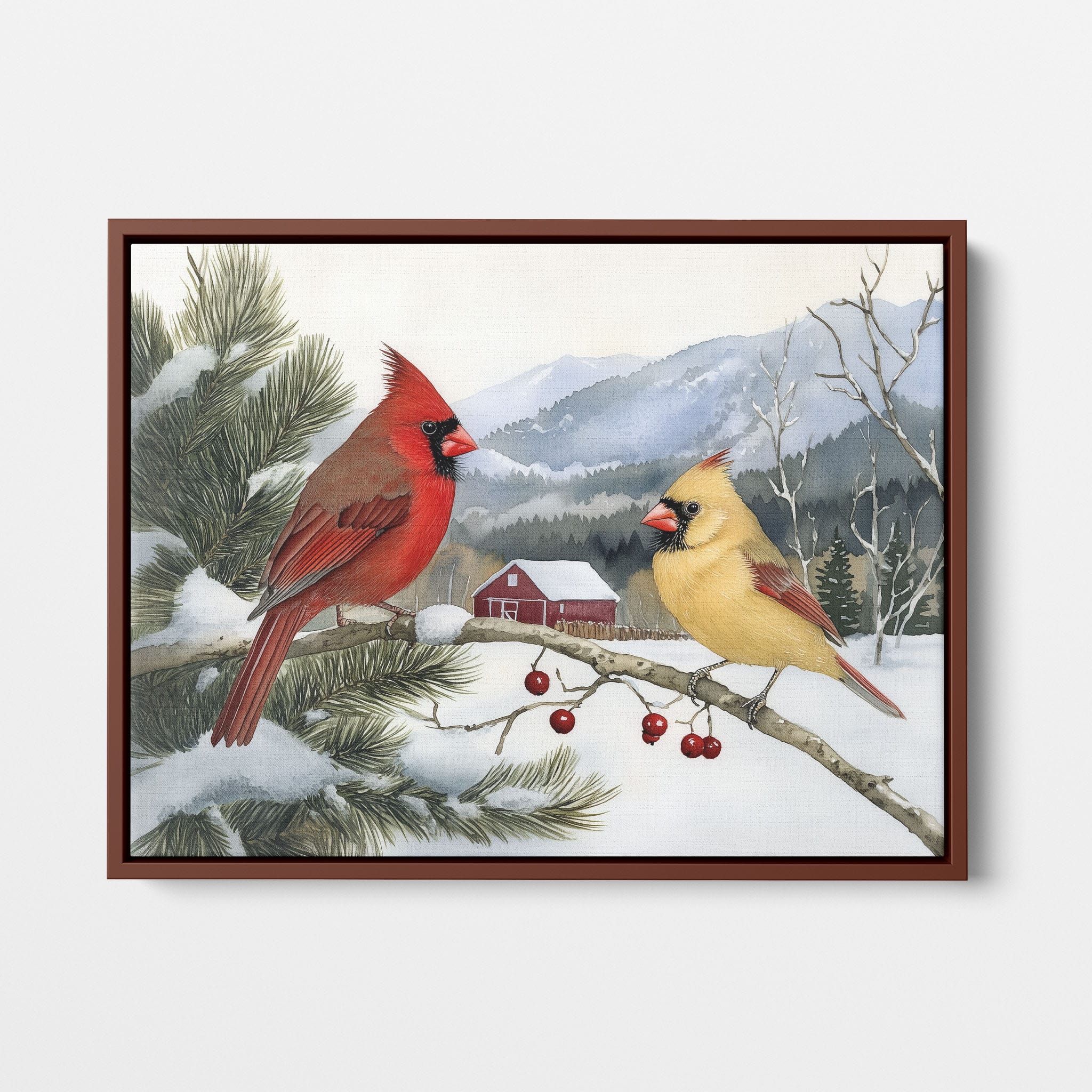 This serene digital watercolor piece captures a pair of cardinals resting on a snow-laden branch, their vibrant red and yellow plumage stark against a softly muted winter landscape. Set against a backdrop of distant mountains and evergreen forests, the artwork depicts a tranquil winter scene, invoking feelings of quiet and peace. The refined use of color and careful composition make it an ideal choice for enhancing any living space or office. An essential find for those who appreciate the beauty of nature and the charm of digital watercolor, this artwork promises to bring a touch of winter's serene elegance indoors.
