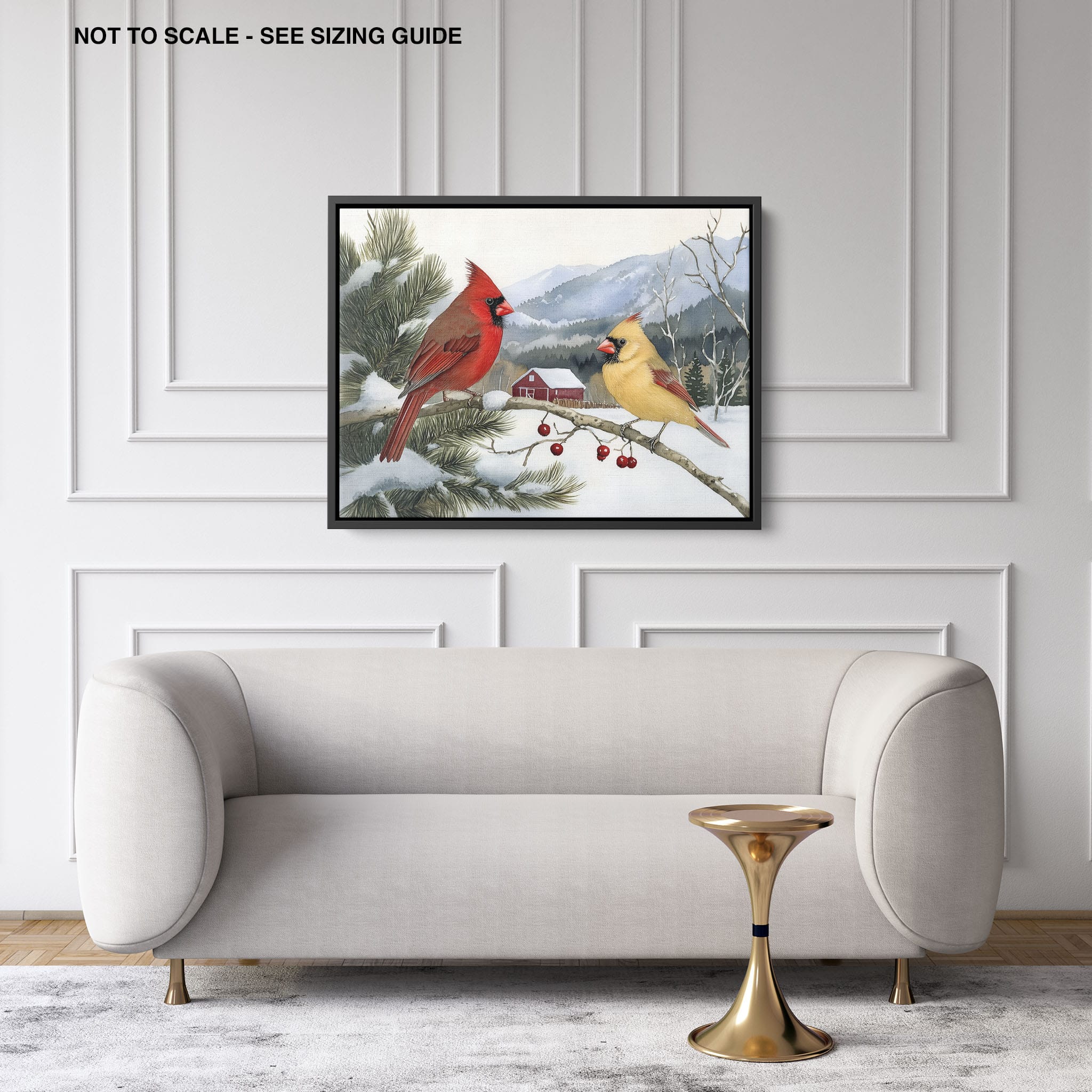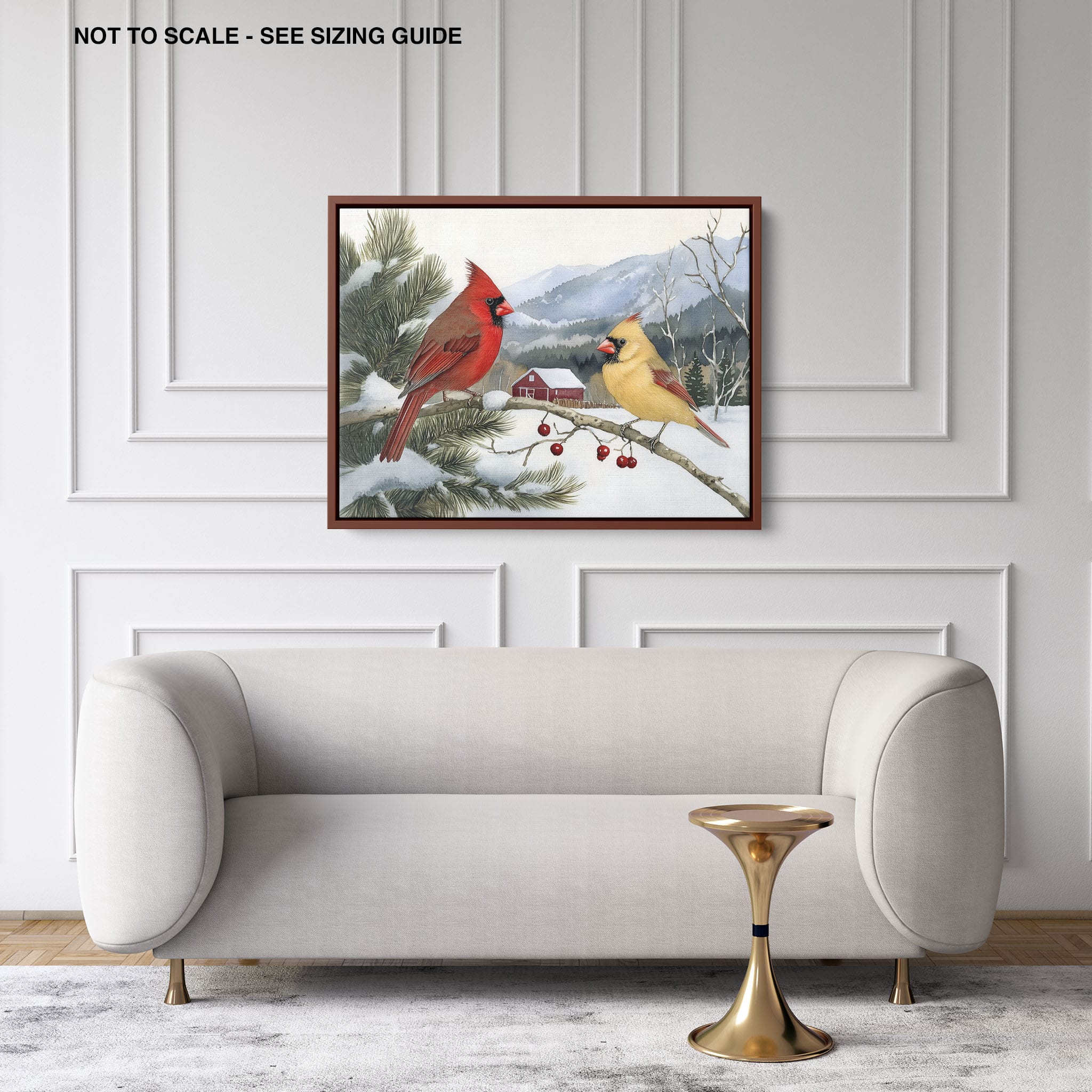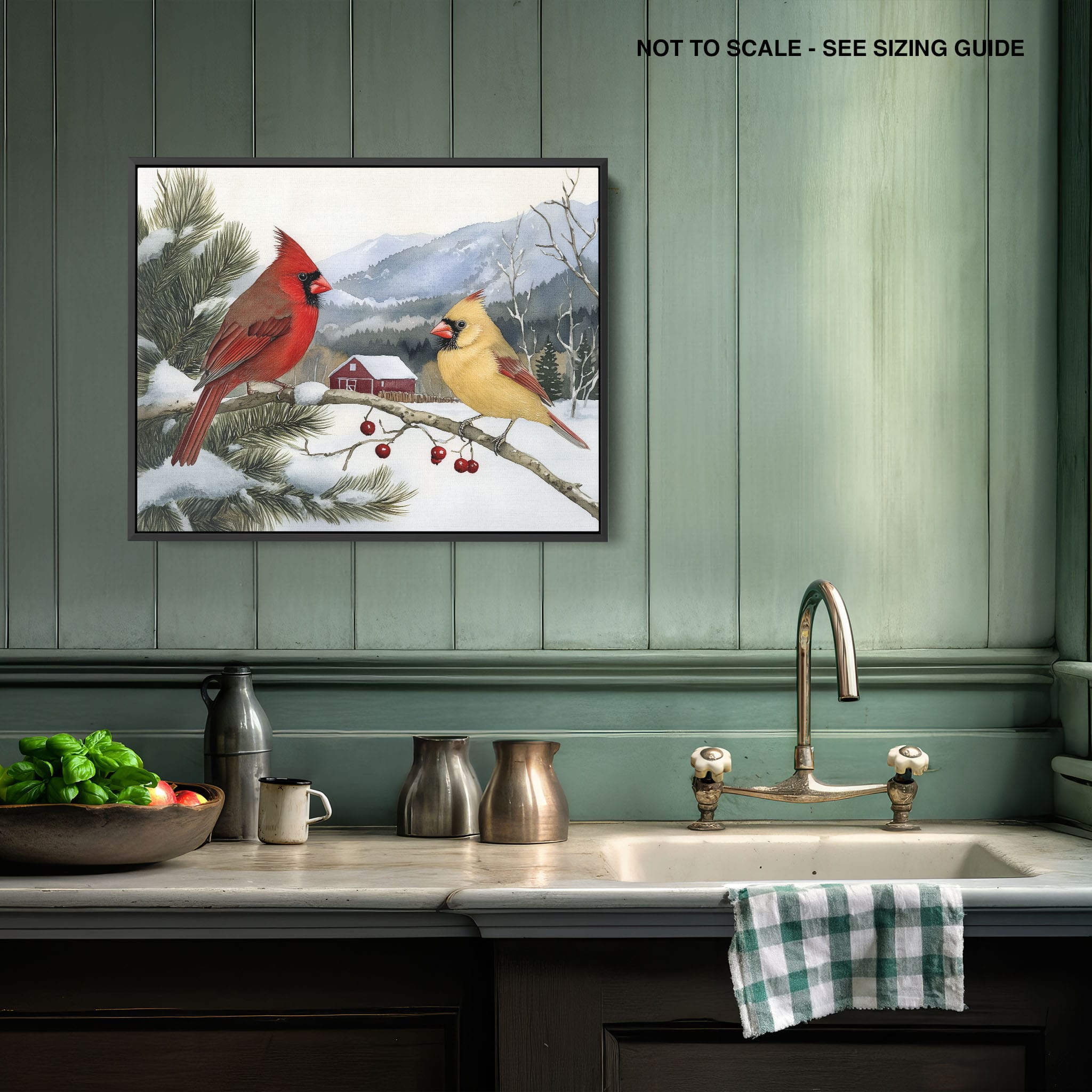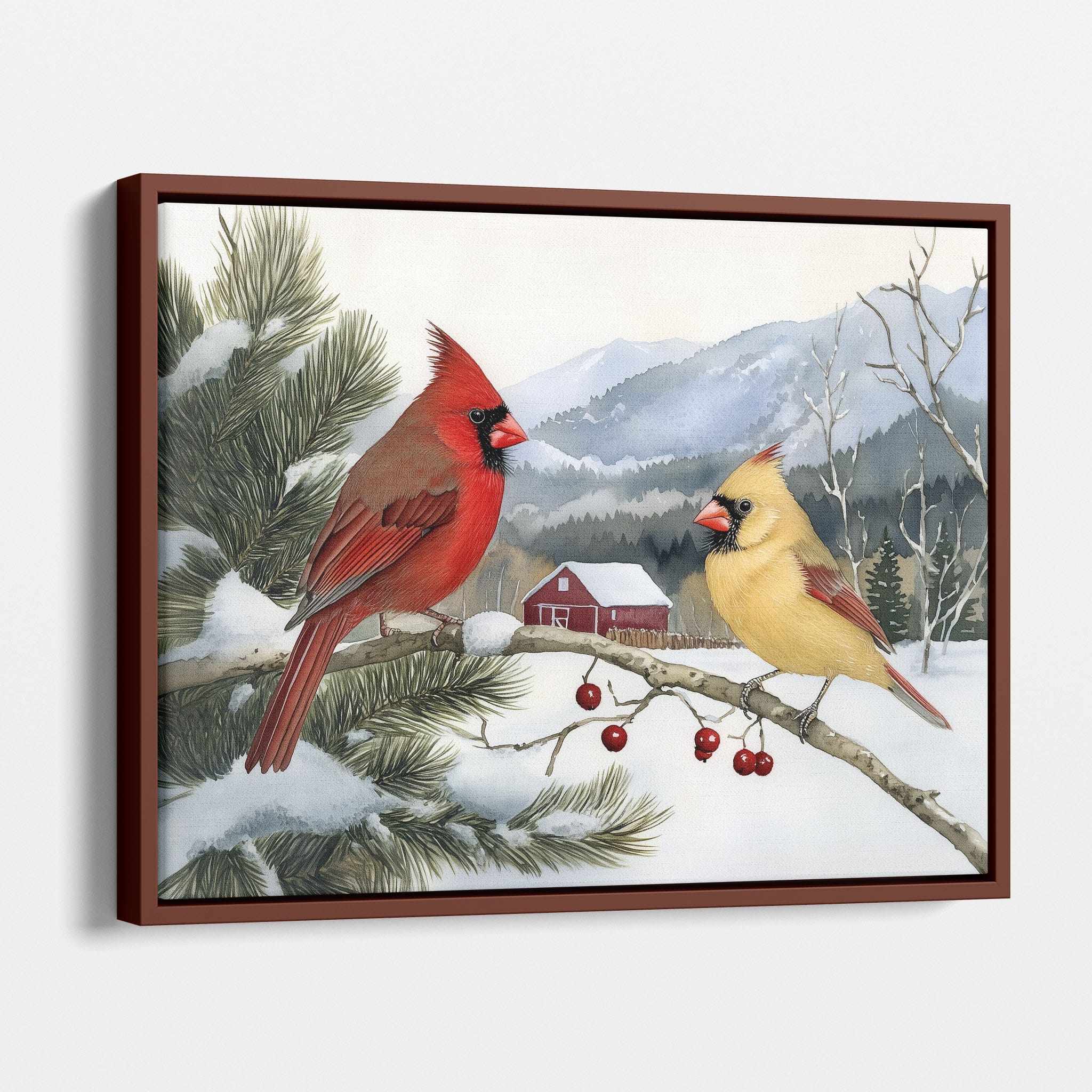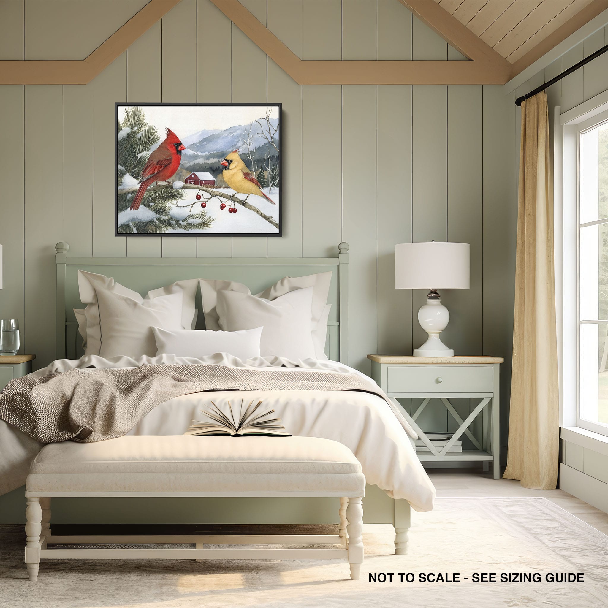 This serene digital watercolor piece captures a pair of cardinals resting on a snow-laden branch, their vibrant red and yellow plumage stark against a softly muted winter landscape. Set against a backdrop of distant mountains and evergreen forests, the artwork depicts a tranquil winter scene, invoking feelings of quiet and peace. The refined use of color and careful composition make it an ideal choice for enhancing any living space or office. An essential find for those who appreciate the beauty of nature and the charm of digital watercolor, this artwork promises to bring a touch of winter's serene elegance indoors.