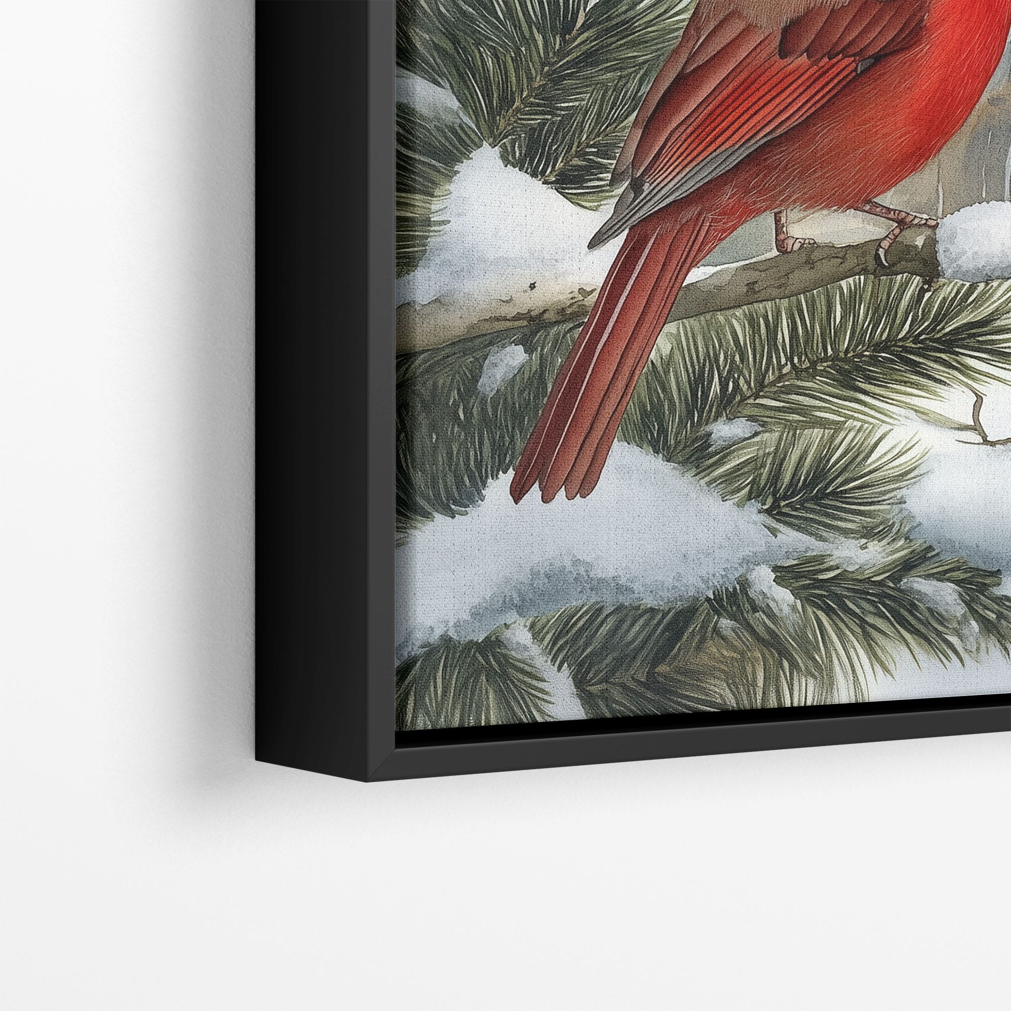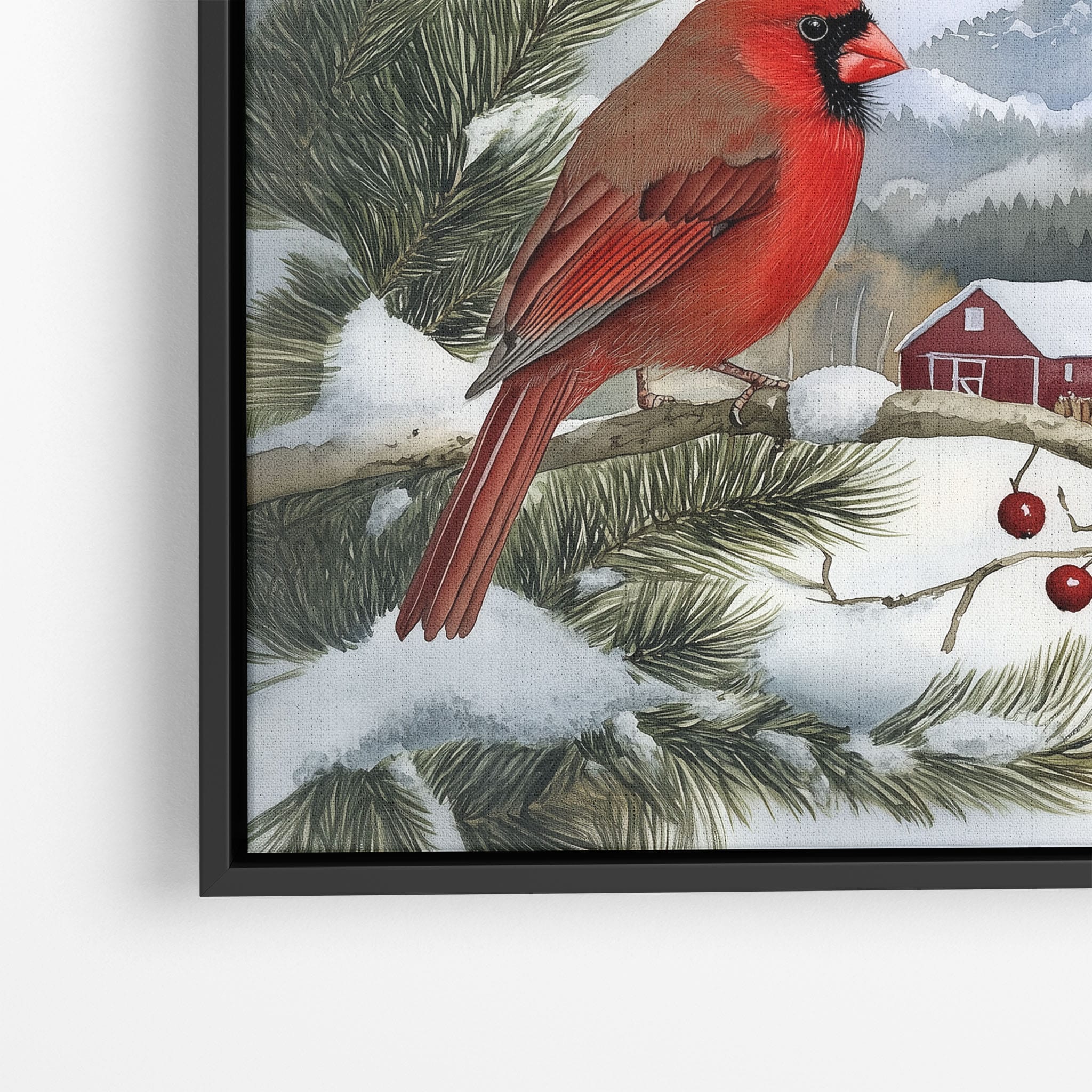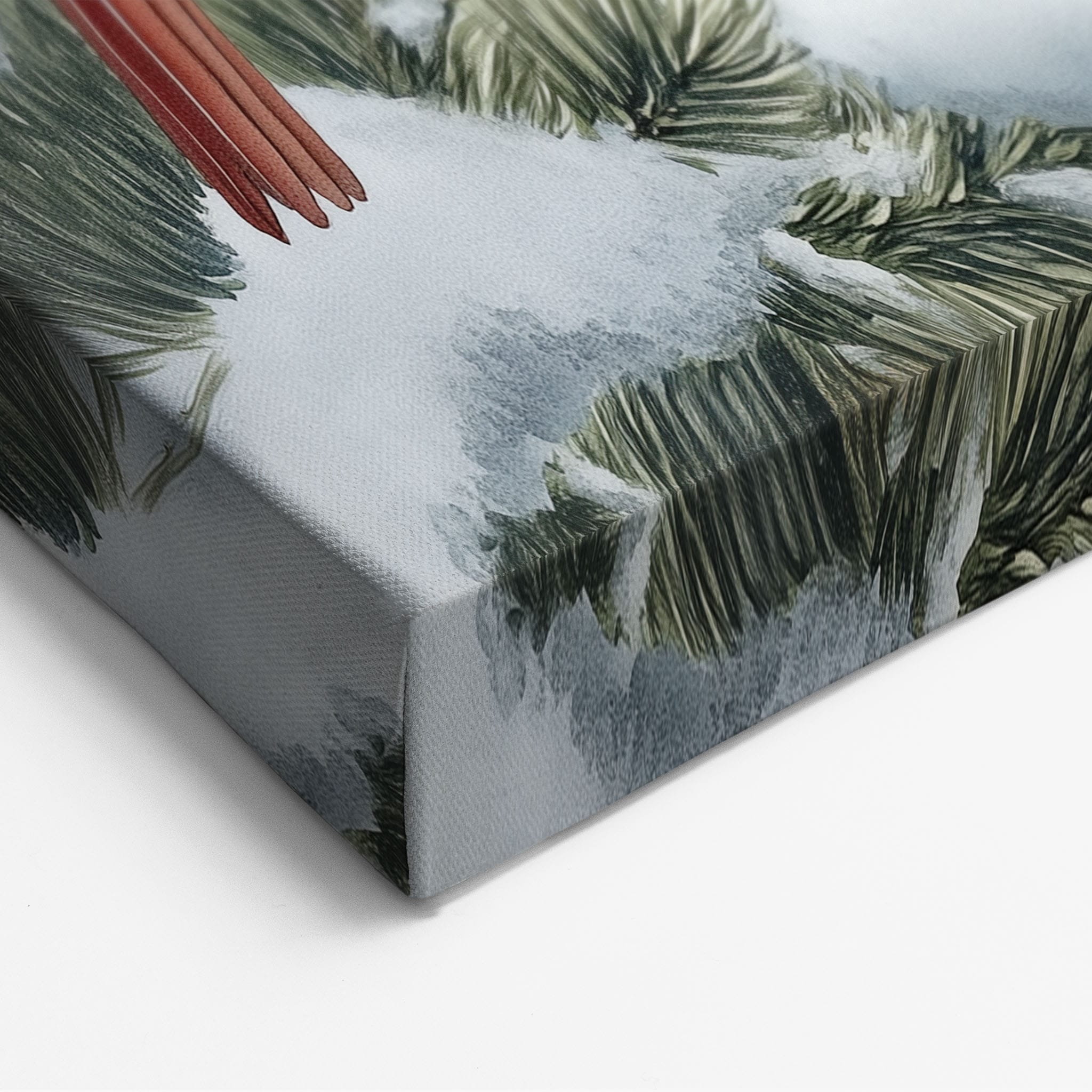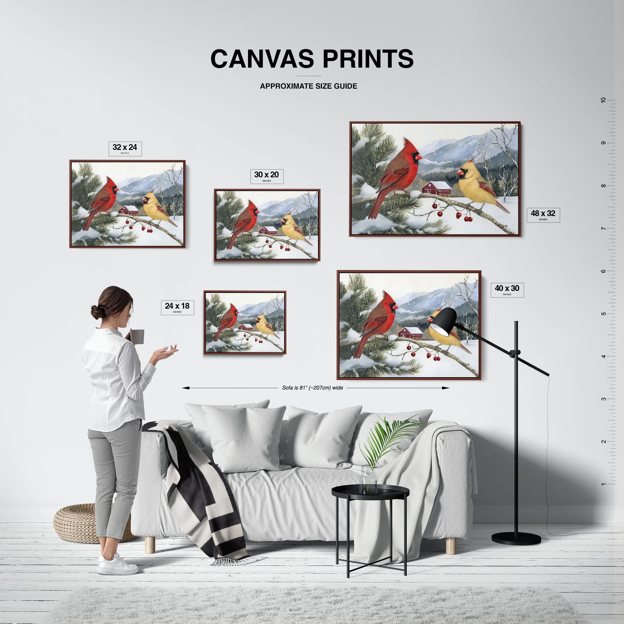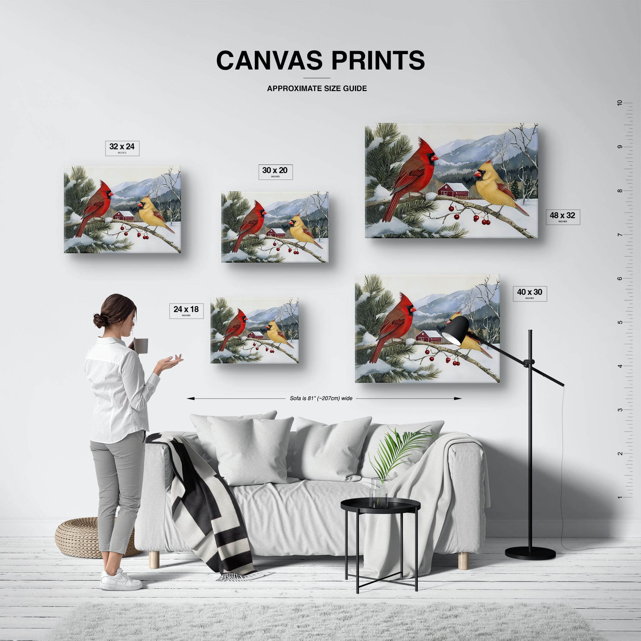 This serene digital watercolor piece captures a pair of cardinals resting on a snow-laden branch, their vibrant red and yellow plumage stark against a softly muted winter landscape. Set against a backdrop of distant mountains and evergreen forests, the artwork depicts a tranquil winter scene, invoking feelings of quiet and peace. The refined use of color and careful composition make it an ideal choice for enhancing any living space or office. An essential find for those who appreciate the beauty of nature and the charm of digital watercolor, this artwork promises to bring a touch of winter's serene elegance indoors.